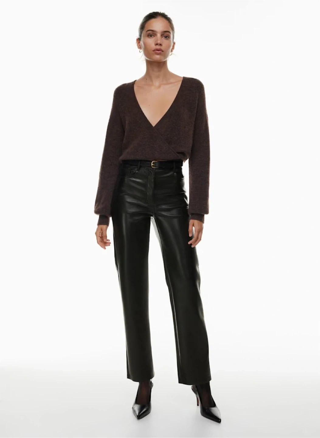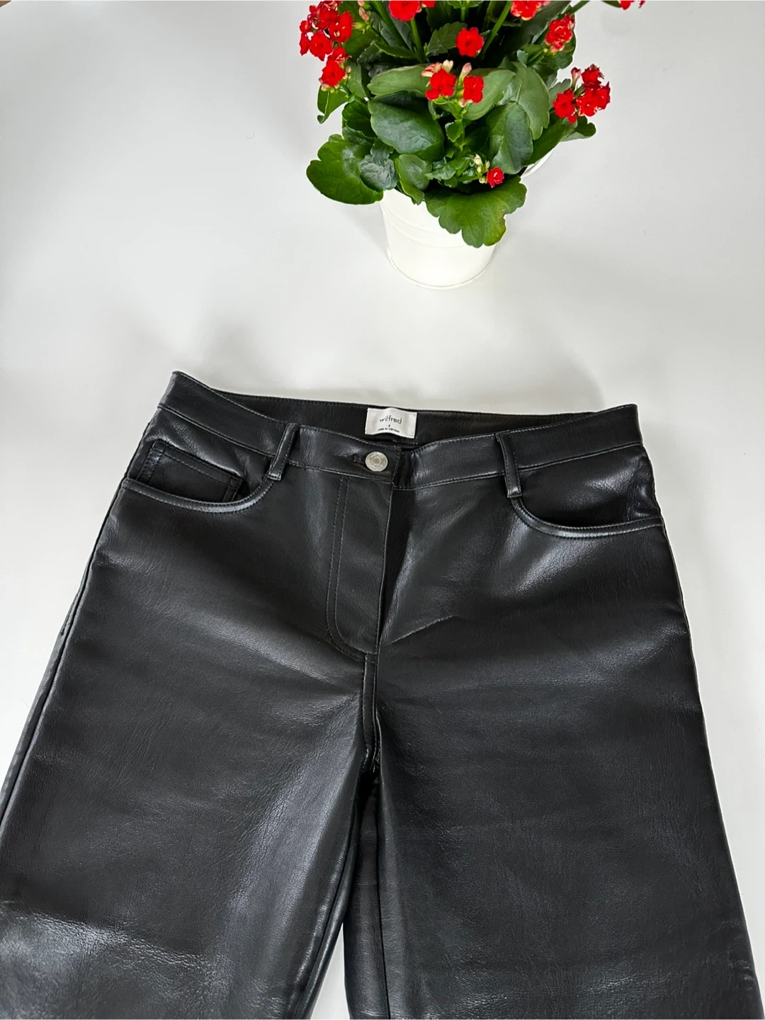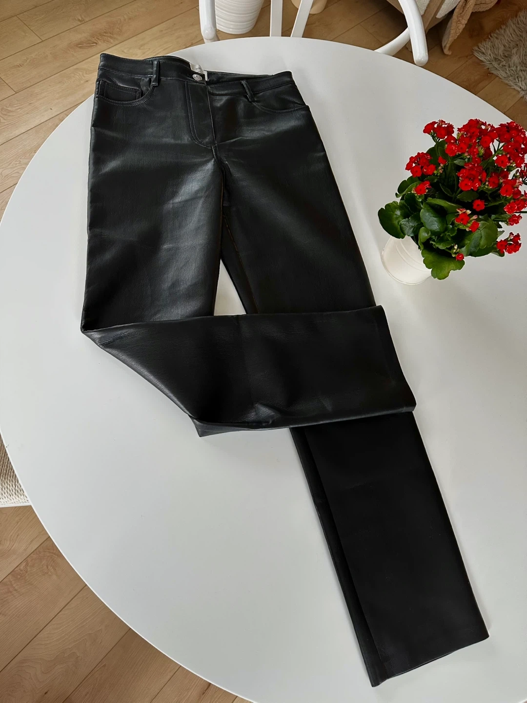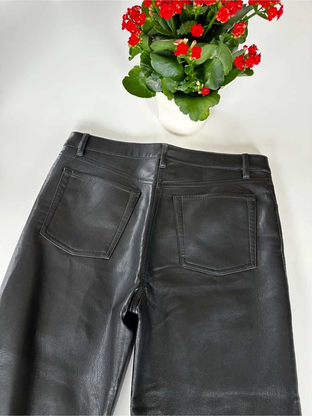 These are high-rise straight-leg pants with five-pocket styling and a universally flattering fit. They’re made with our innovative Vegan Leather that looks and feels like the real thing. They have an authentic drape and a soft sheen that feels right from day one.