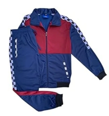 Royal Threads Canada new tracksuit in size 3XL! It's made of 60% cotton and 40% polyester. The colours are red and blue with a checkerboard pattern on the sleeves and legs