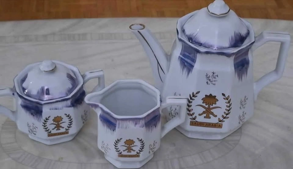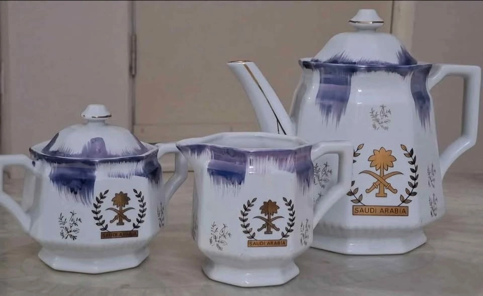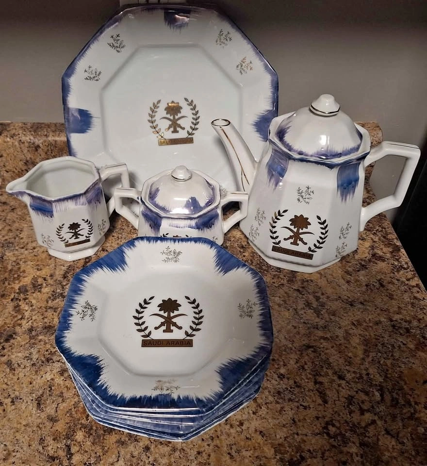 Beautiful vintage-style porcelain tea set featuring the Saudi Arabia emblem with palm tree and crossed swords. White porcelain with blue brushstroke accents and gold detailing. Perfect for display, special occasions, or collectors.
