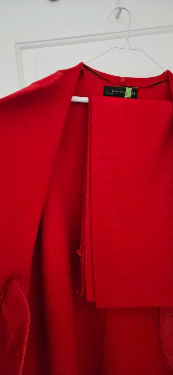 Selling a Zara Woman red coat, hand made, with scarf that can be attached to the coat. PLEASE NOTE THAT THIS FITS A MEDIUM, not XS. It's in fantastic condition, dry cleaned, and perfect for adding a pop of colour to your wardrobe!