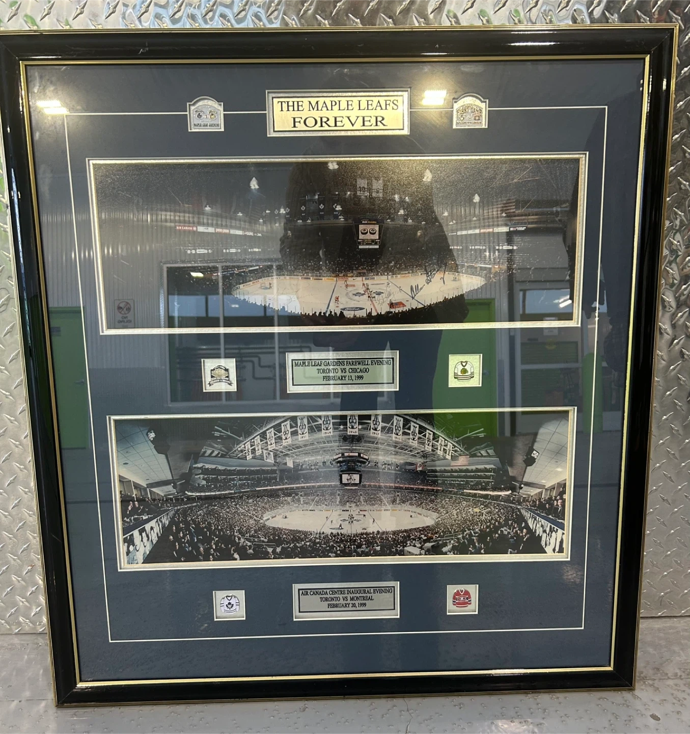 Selling a framed piece of Maple Leafs memorabilia. It features images from Maple Leaf Gardens' farewell evening (Toronto vs Chicago, February 13, 1999) and the Air Canada Centre's inaugural evening (Toronto vs Montreal, February 20, 1999). A great piece for any Leafs fan!