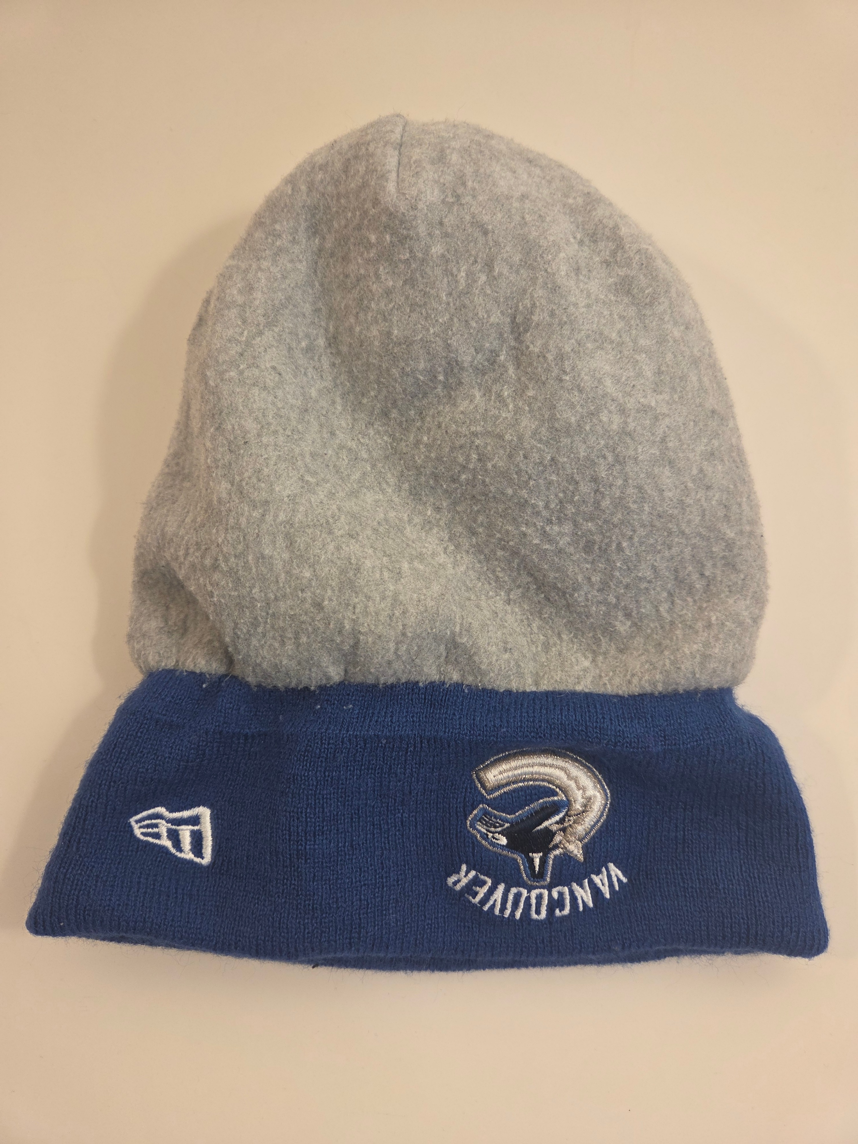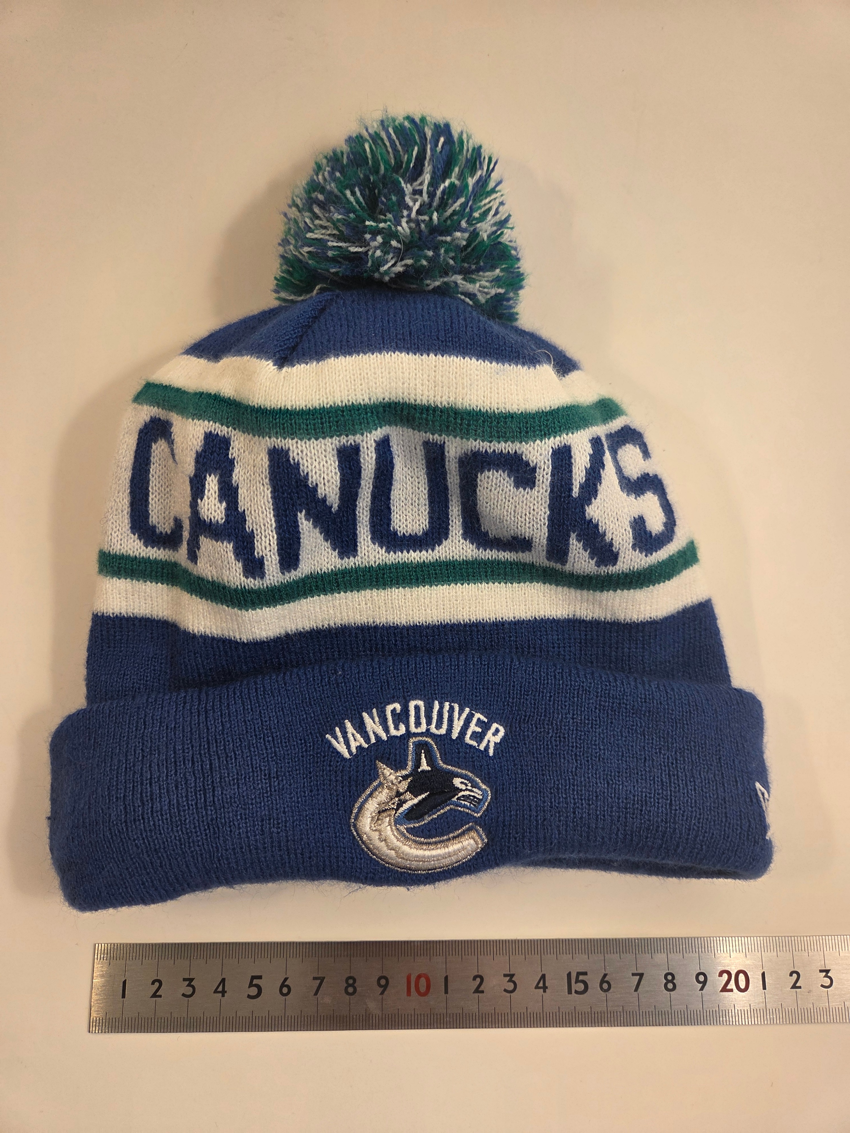 Official New Era Vancouver Canucks cuffed pom beanie in Child size – like new. Classic team colours (blue/white/green), big CANUCKS wordmark, and embroidered Vancouver orca logo on the cuff. Super warm with a soft grey fleece lining inside for extra comfort.