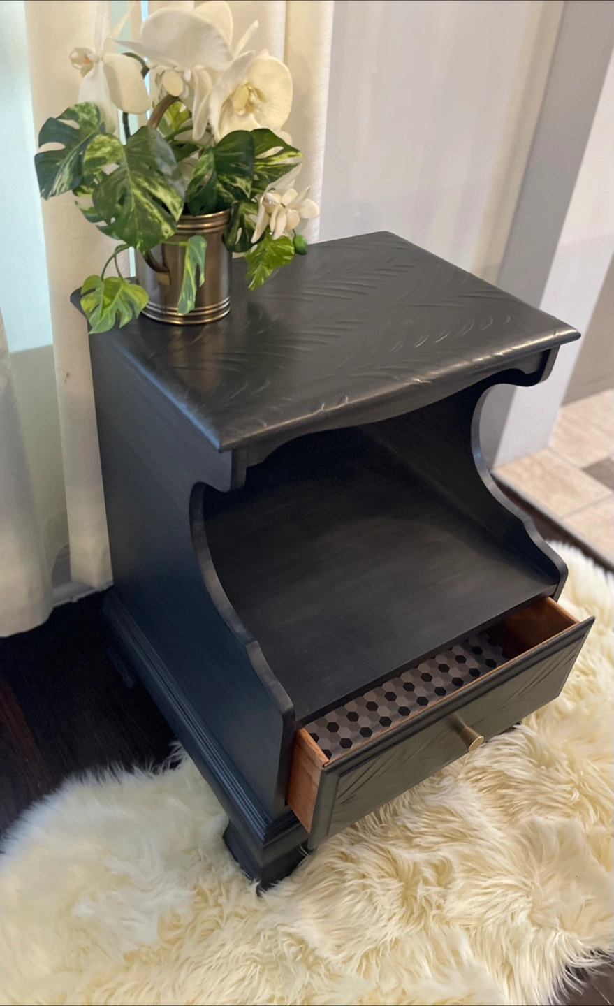 Featuring 2 layers of primer, 2 layers of paint, and 3 layers of polycrylic for extra protection and durability. Dovetail drawer, working very good and lined with new contact paper.