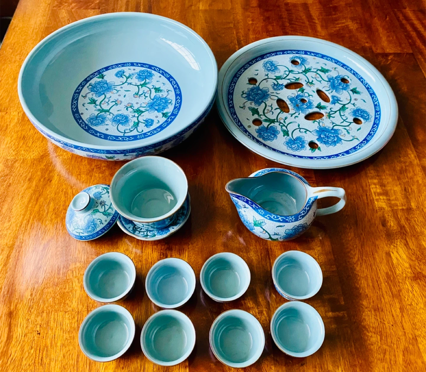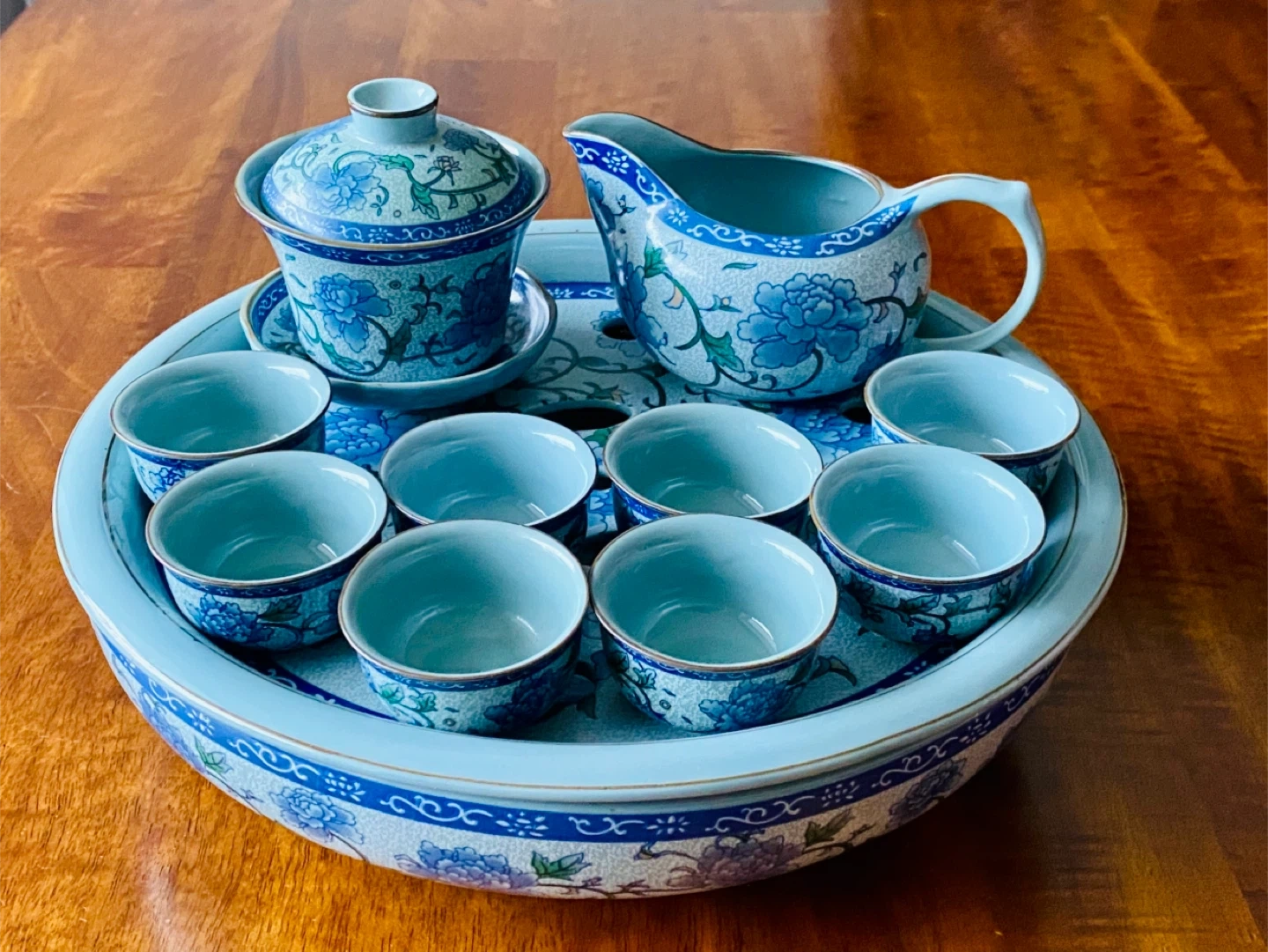 Complete (14 piece)Chinese-style porcelain tea set (gaiwan + fairness pitcher + 8 cups + large matching serving tray)