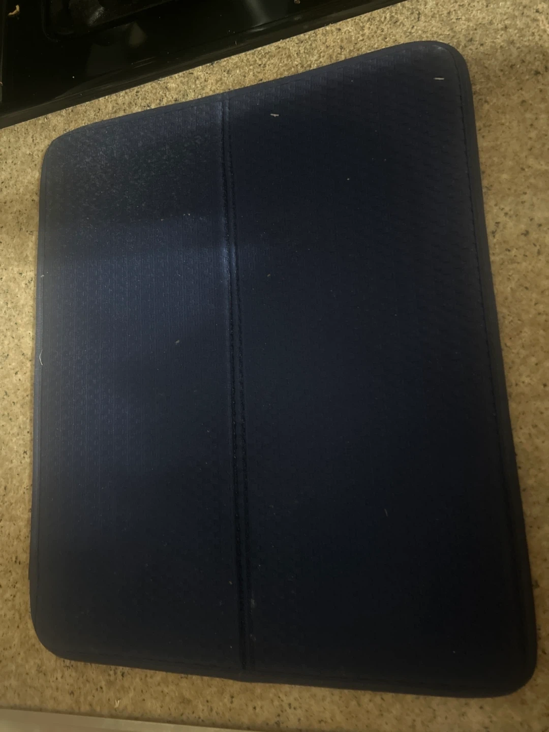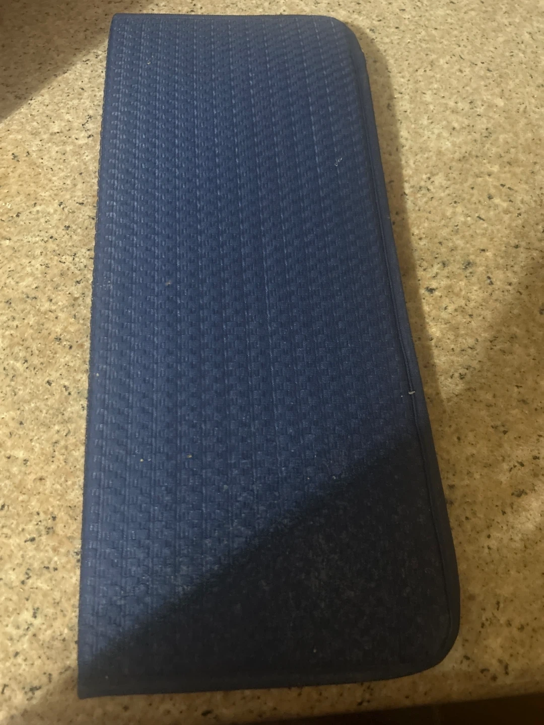 Dark blue mat padded to soak up water from washed kitchen utensils to help keep your