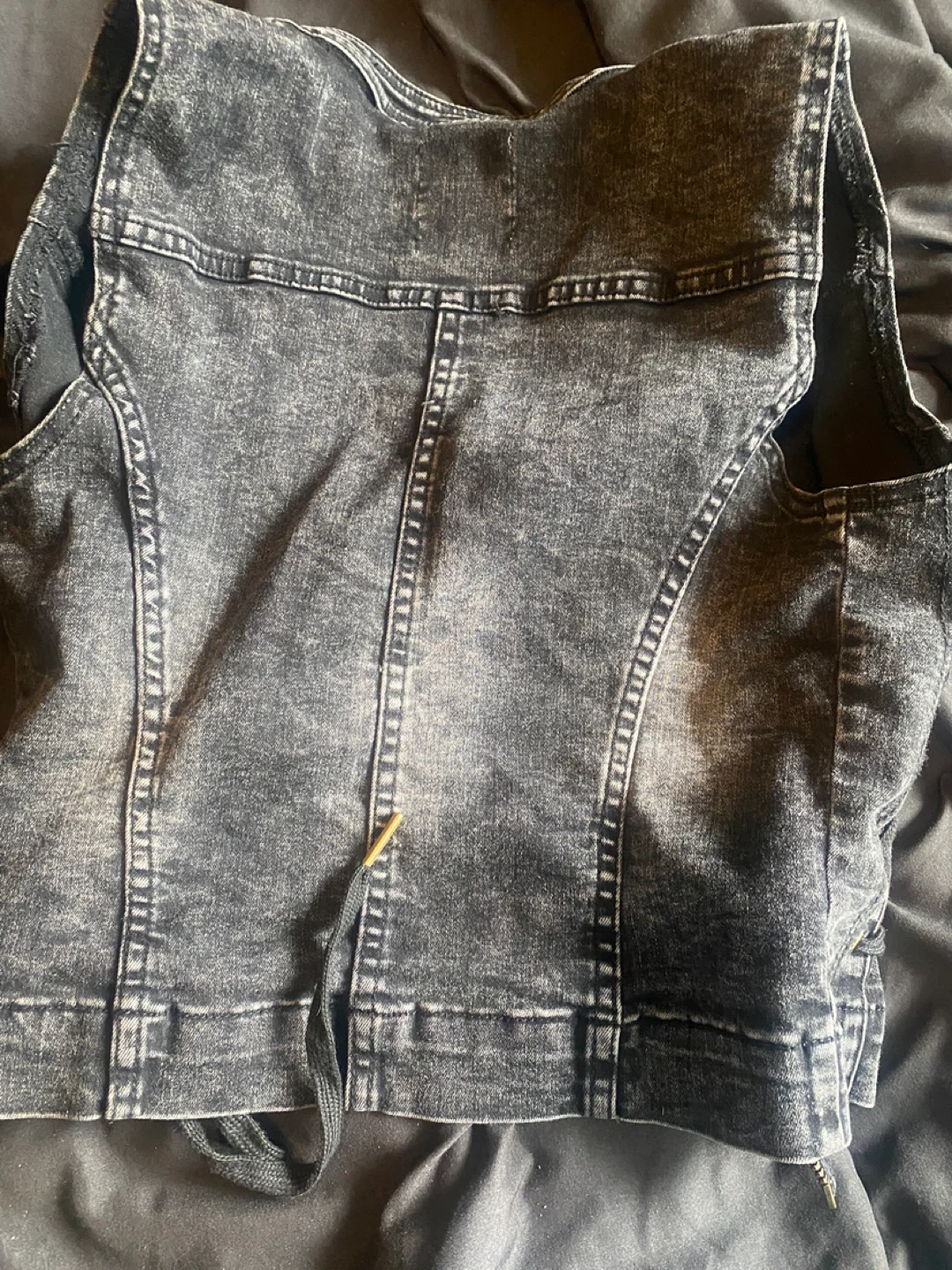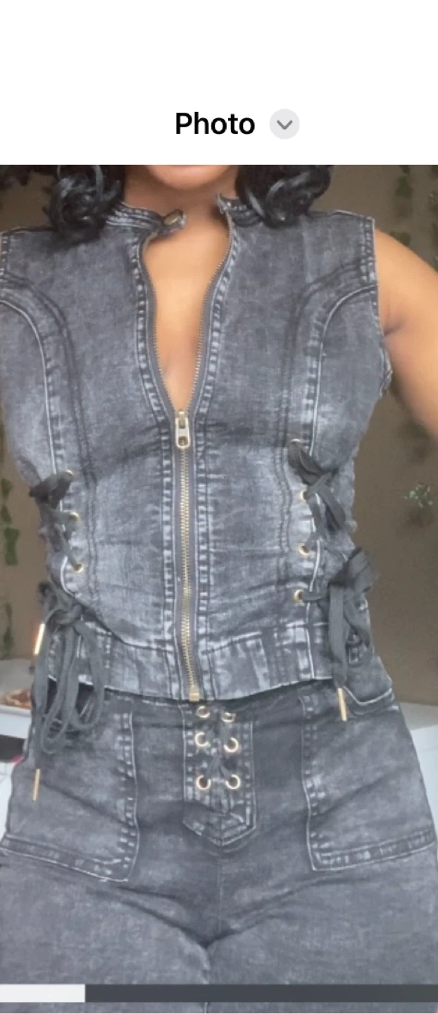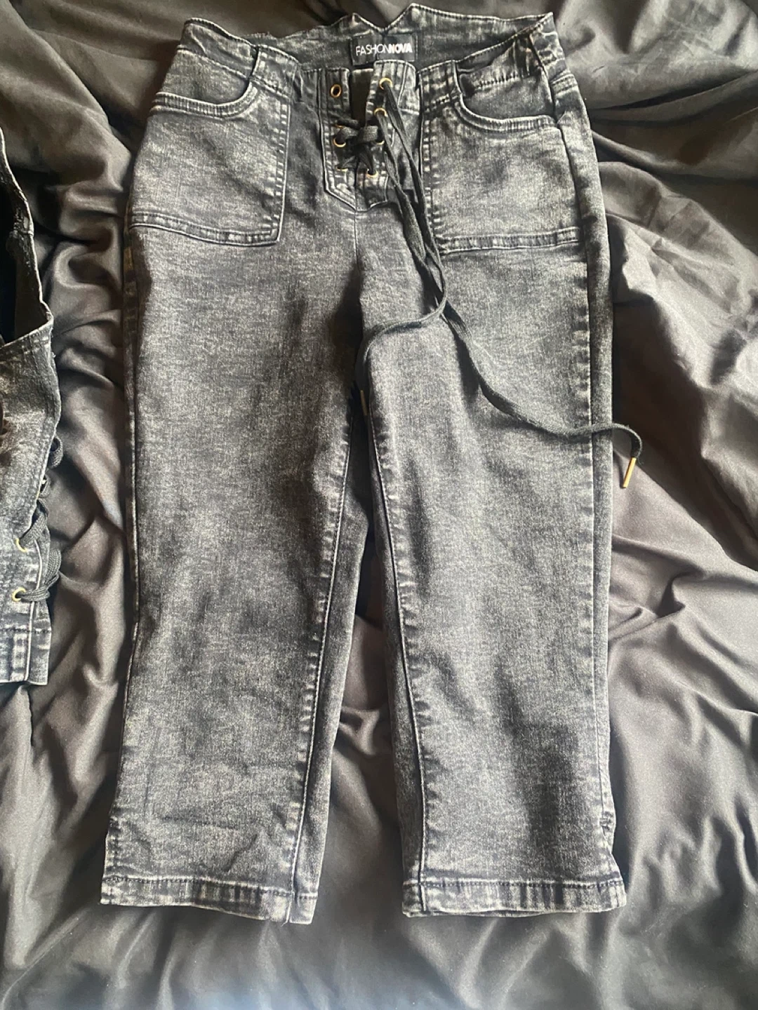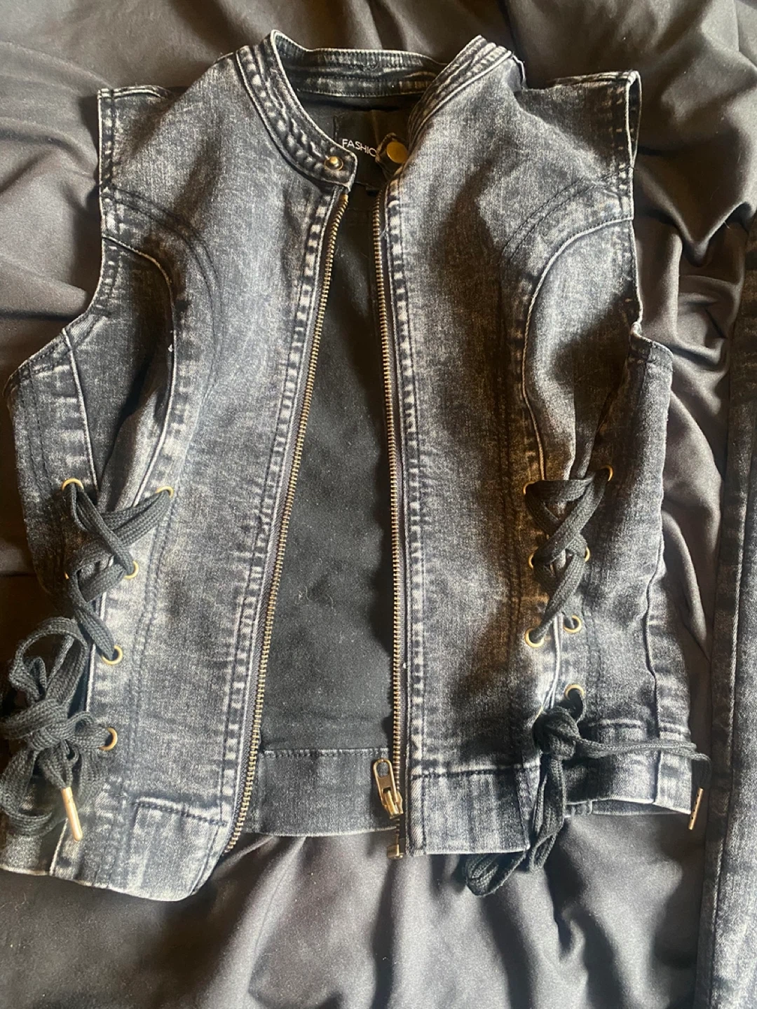 Selling a Fashion Nova denim vest and pants set in a washed black colour. The set features lace-up detailing on both the vest and pants. Great for a stylish, edgy look!