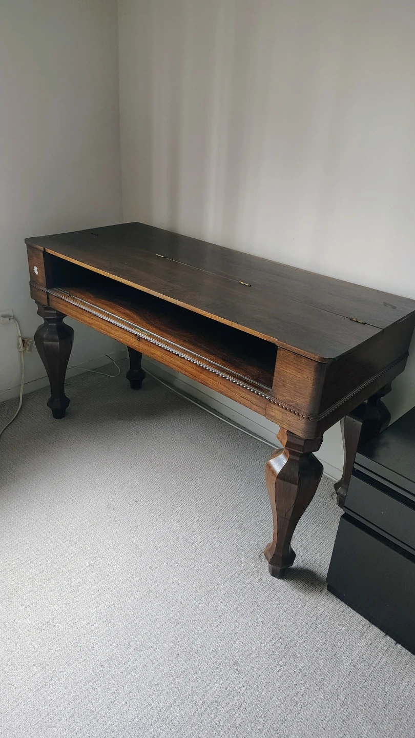 Selling a beautiful antique wooden desk. It has a unique design with detailed legs and a flip-top surface that reveals compartments for storage. Perfect for adding a touch of vintage charm to your home office or study!