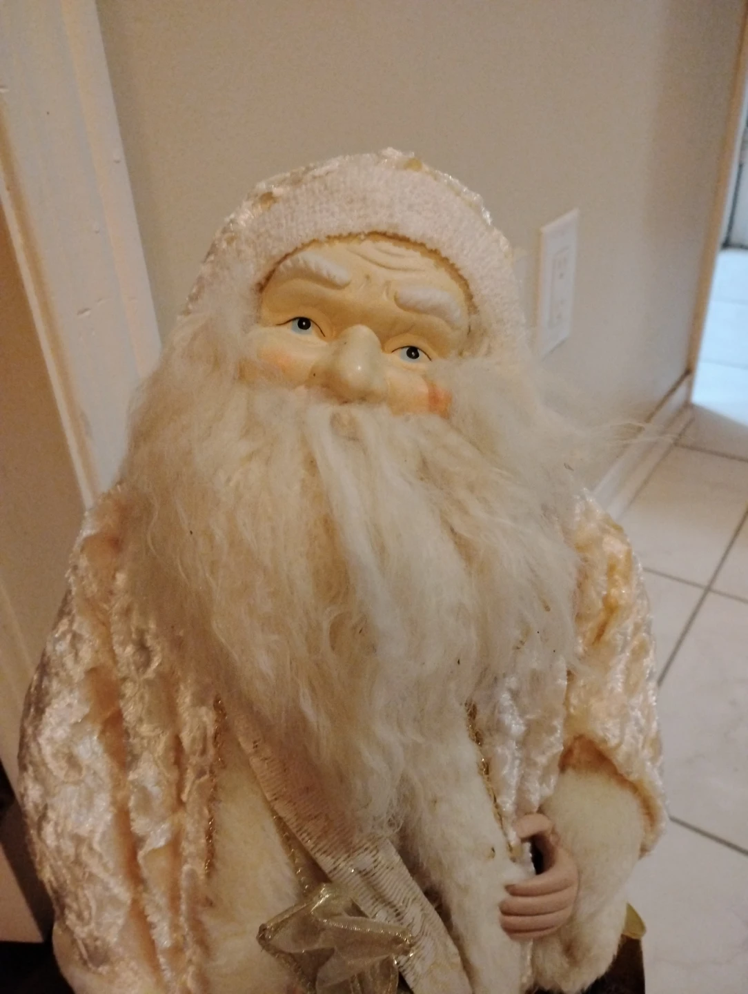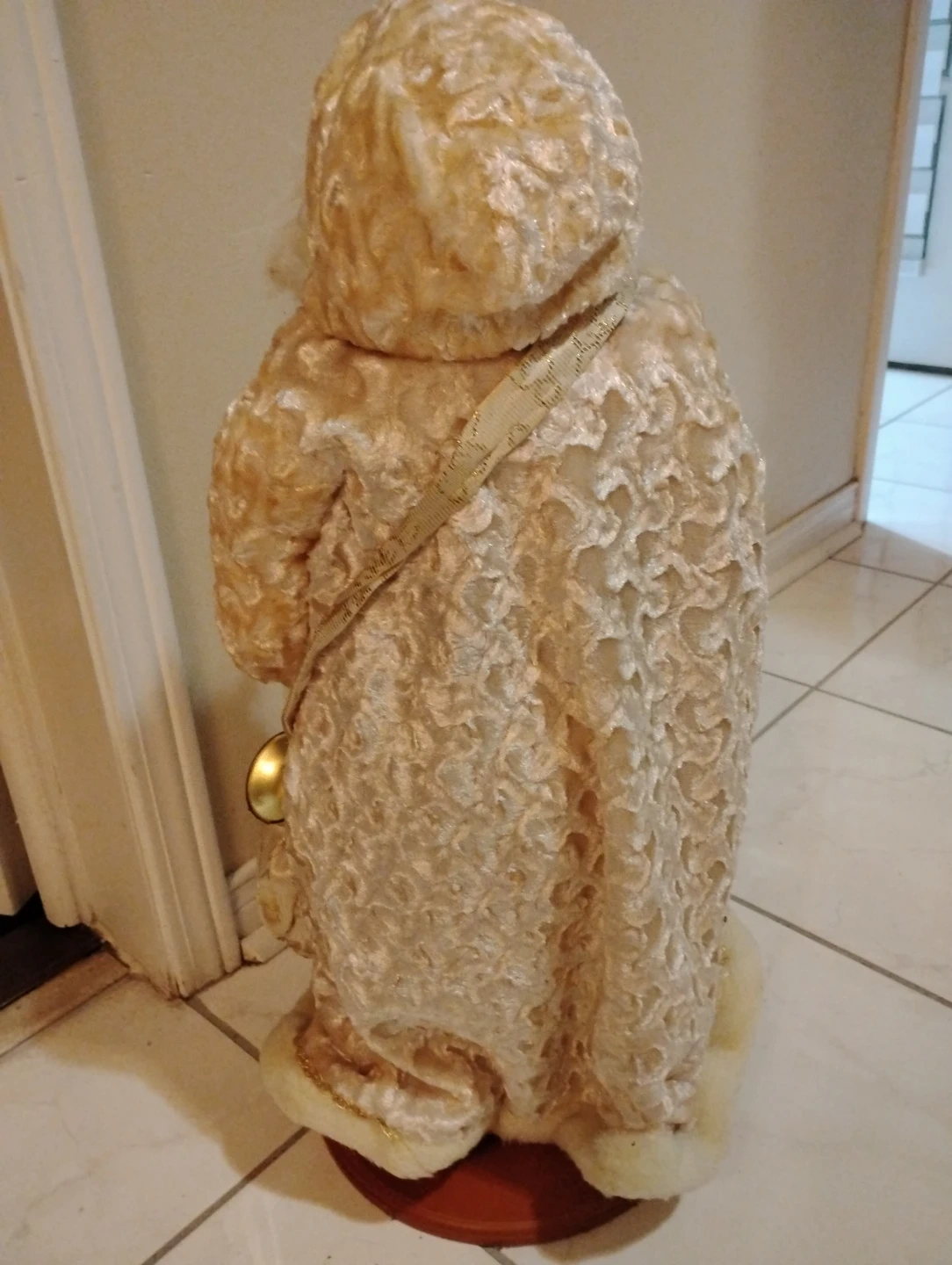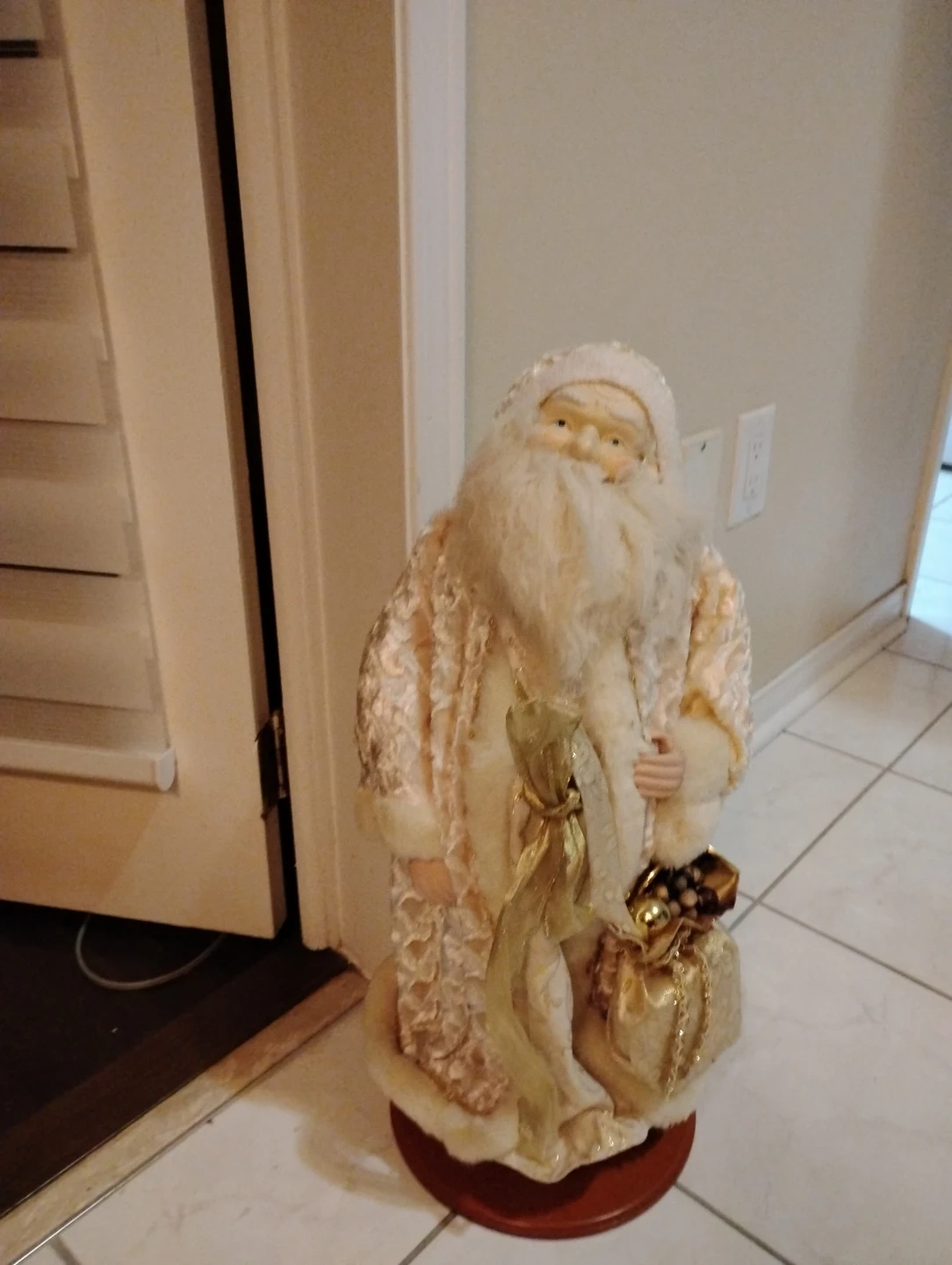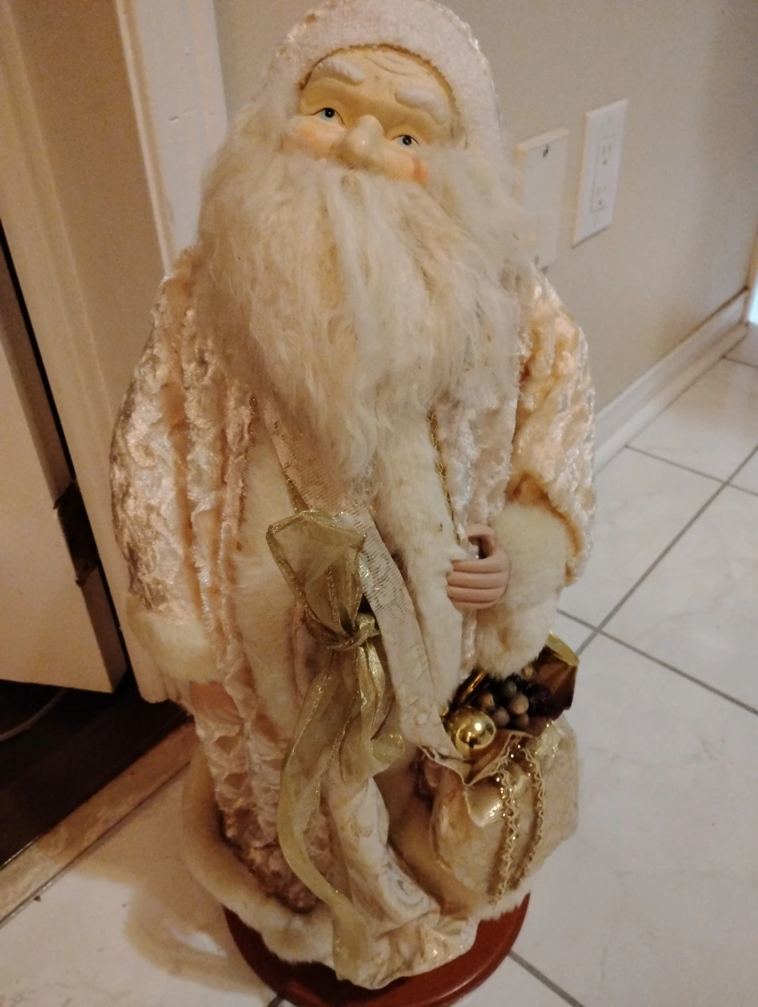 Here's a Santa Claus figurine in a cream-colored outfit with a gold-toned bag. It's in good condition and would make a lovely addition to your holiday decor