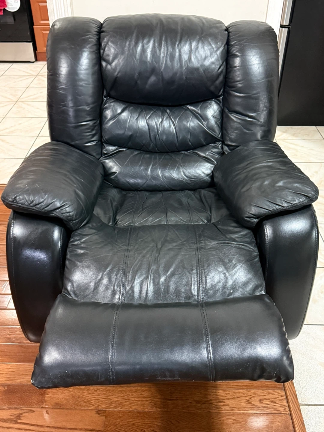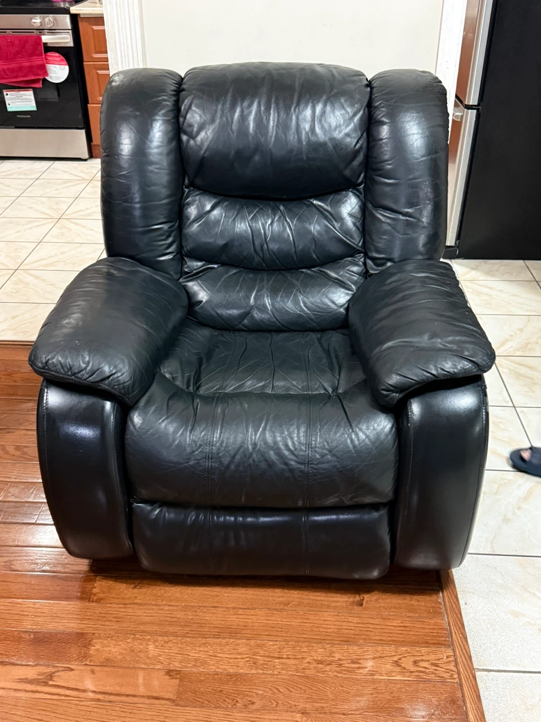 Selling a comfy black leather recliner. It's in good condition and perfect for relaxing after a long day. It has a classic look that will fit in any room #gifting