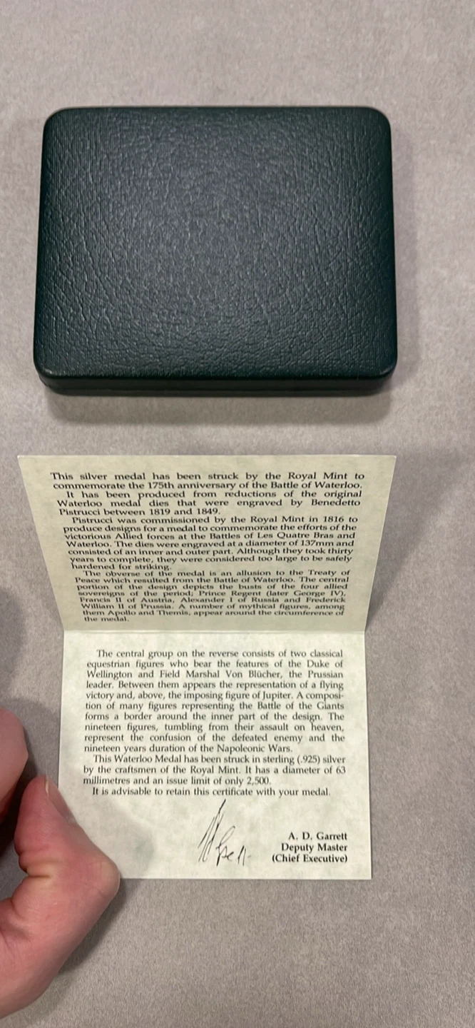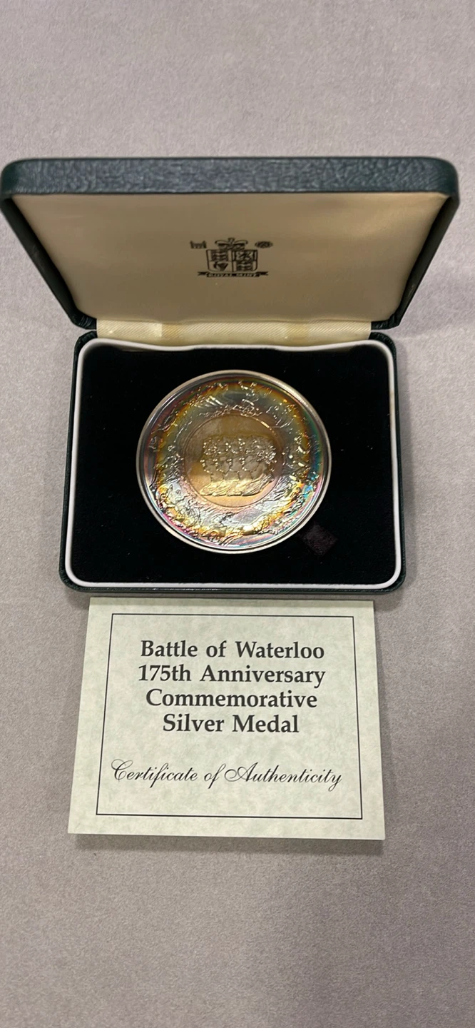 An original Battle of Waterloo 175th commemorative Silver Medal produced by the Royal Mint. One of 2,500 ever made. Composed of .925 Sterling Silver at a weight of 152.7grams. Features a beautiful toning on the front face of the medal.