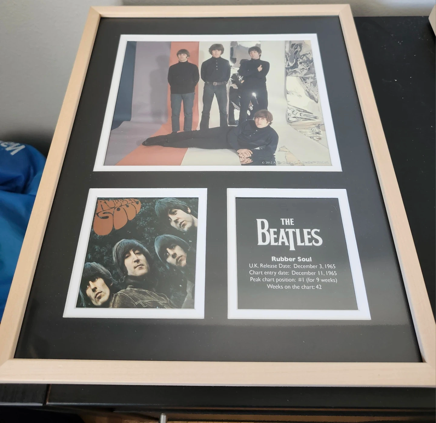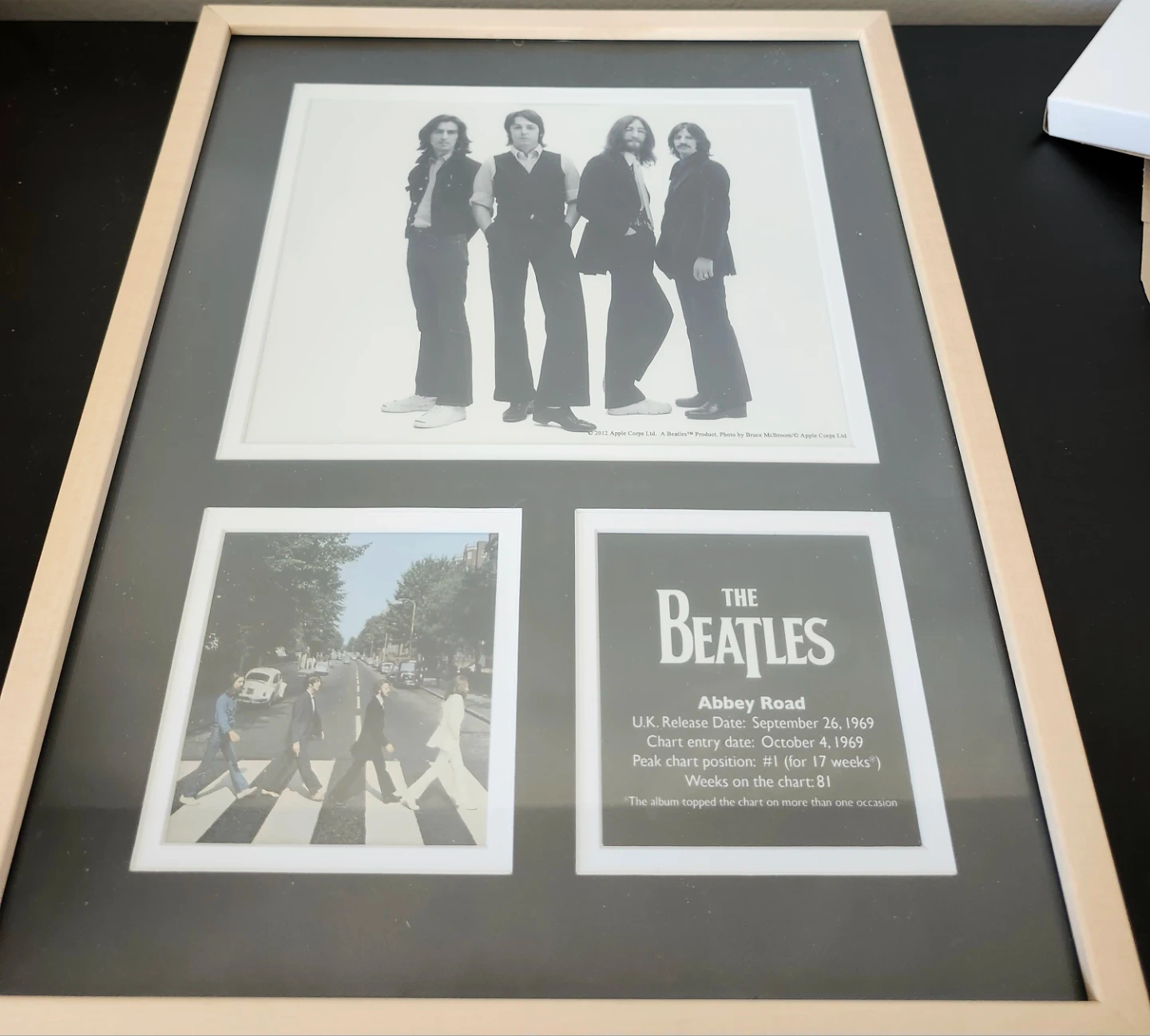 Framed collection of The Beatles album art. Includes Revolver, Sgt. Pepper's Lonely Hearts Club Band, Let It Be, The Beatles (aka The White Album), and Abbey Road.