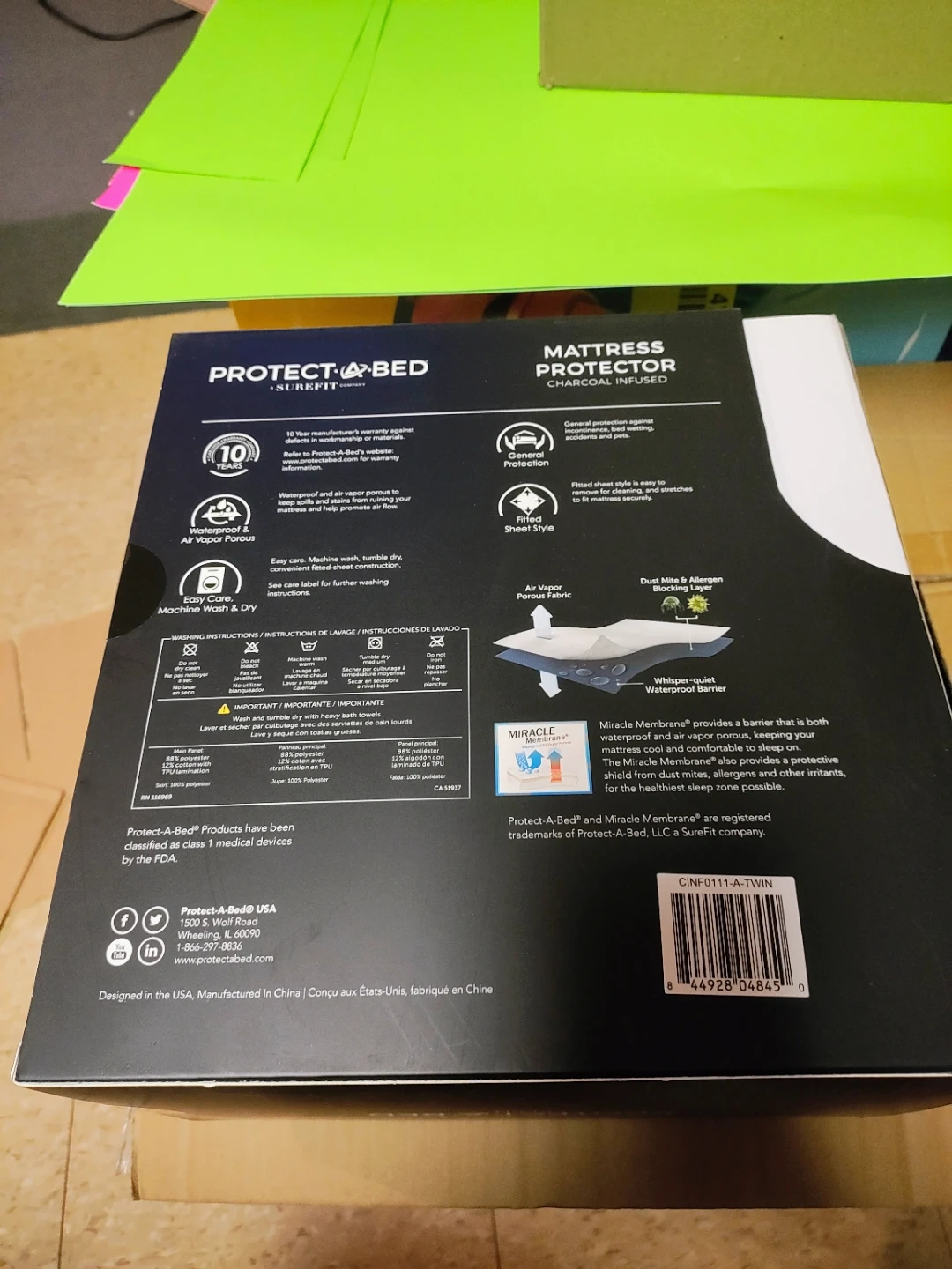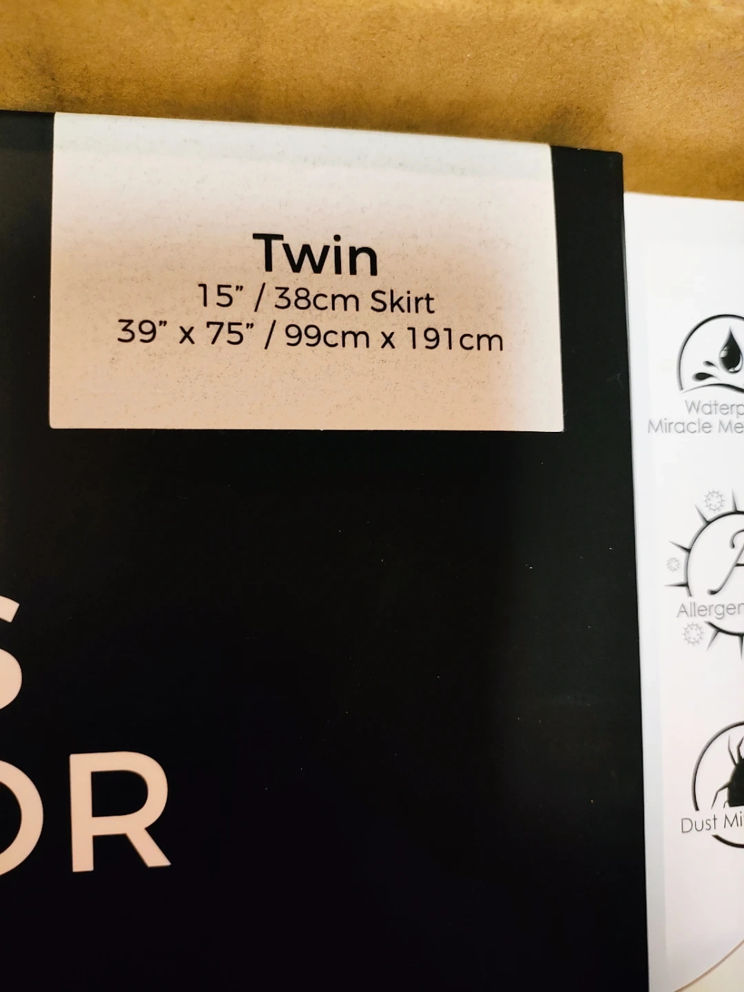 Brand new Protect-A-Bed mattress protector, still in its original packaging! It's a twin size, designed to fit mattresses with a 15"/38cm skirt. The dimensions are 39" x 75" / 99cm x 191cm. It features charcoal infusion for odor protection and is waterproof to keep your mattress clean and comfortable