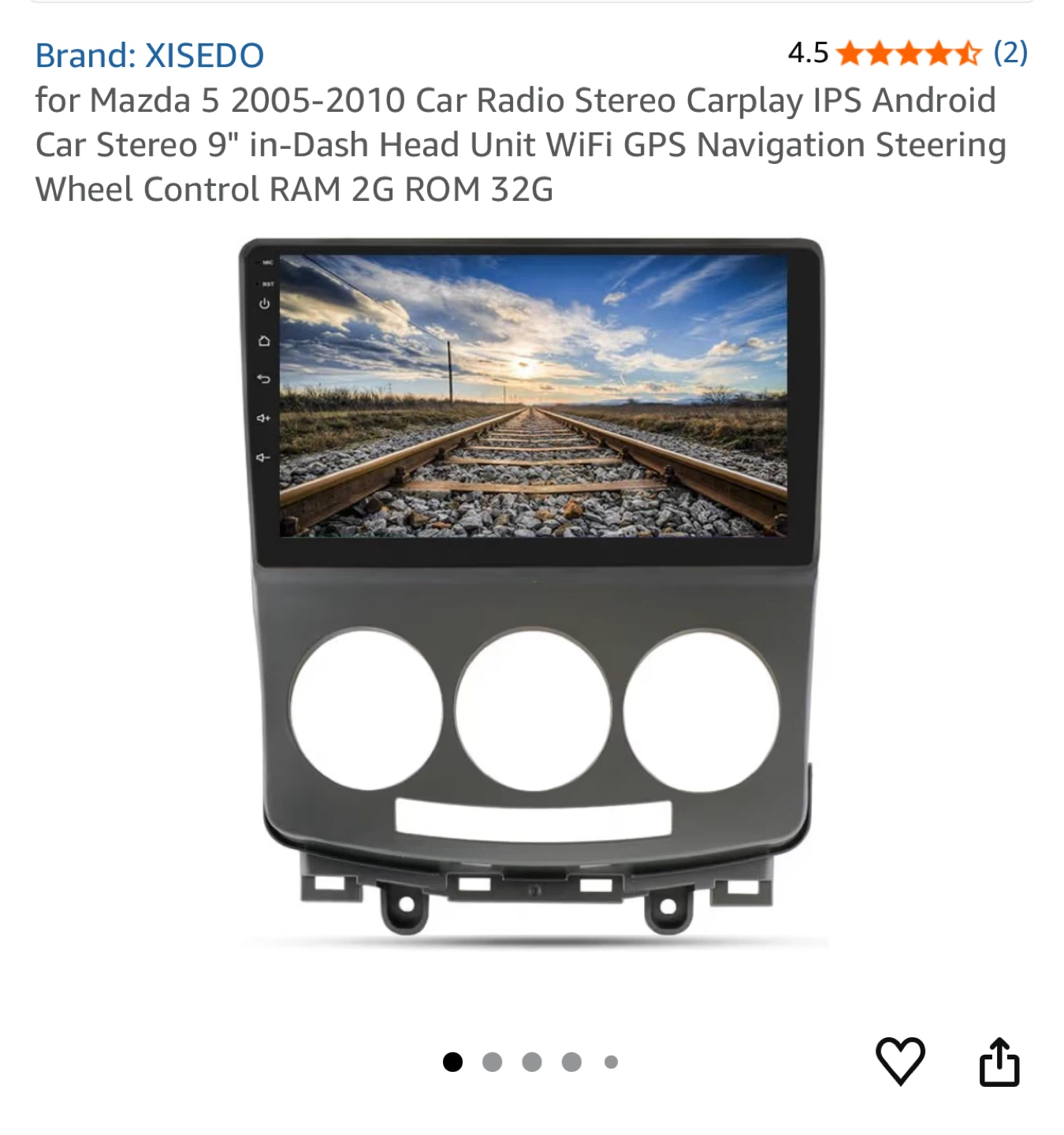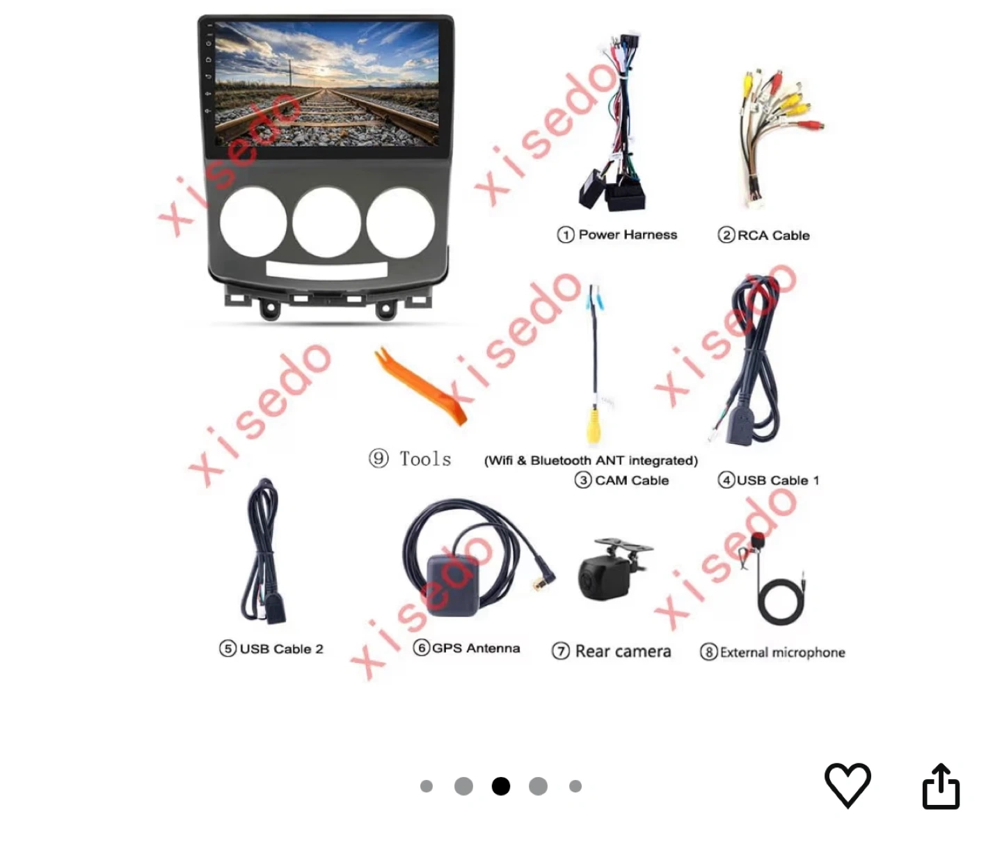 Selling a XISEDO car radio stereo, compatible with Mazda 5 models from 2005-2010. It features CarPlay, IPS Android, a 9" in-Dash Head Unit, WiFi, GPS Navigation, and Steering Wheel Control. It also has 2G RAM and 32G ROM. Included are the power harness, RCA cable, CAM cable, USB cables, GPS antenna, rear camera, and external microphone.