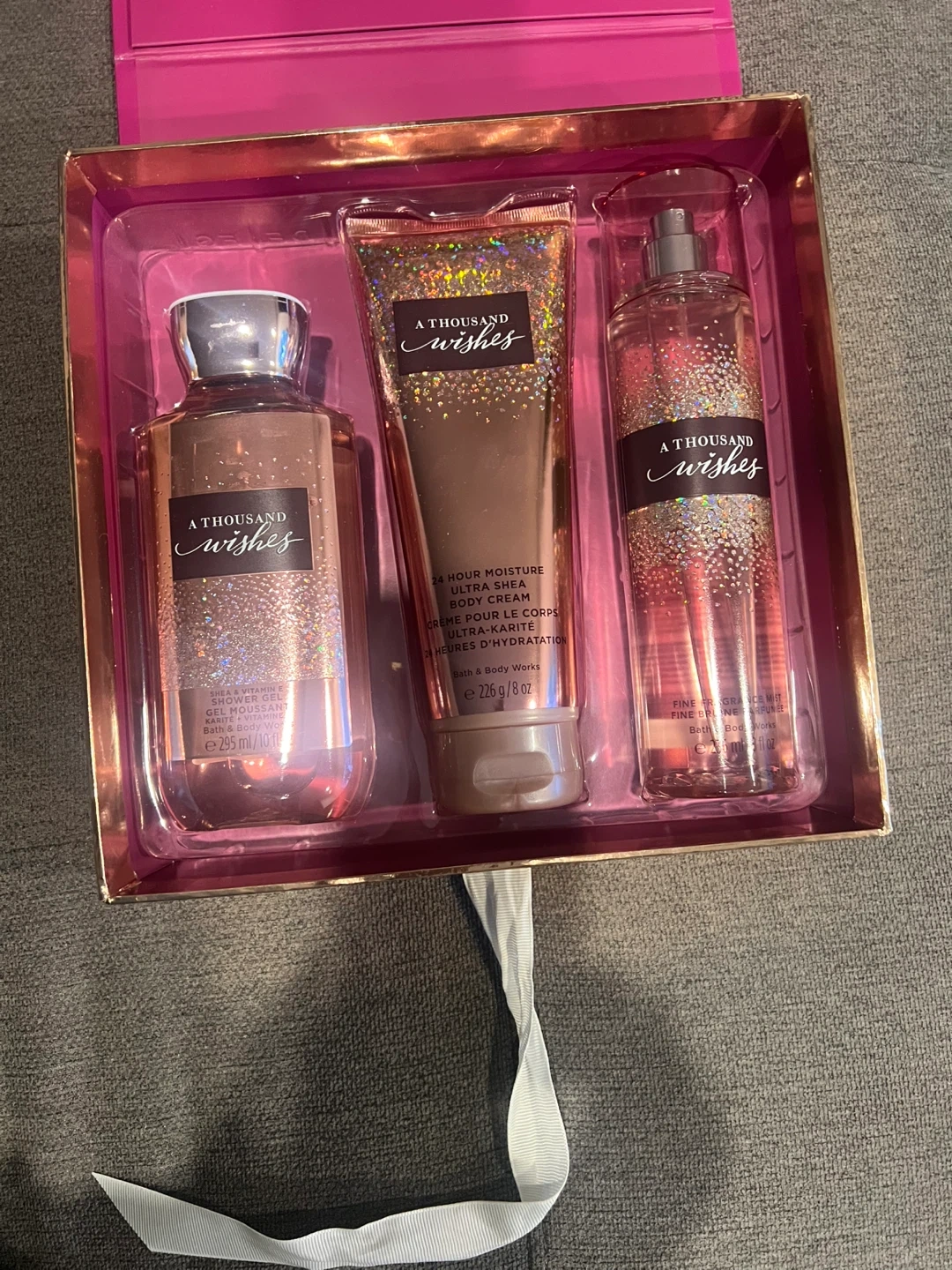 Selling a brand new Bath & Body Works gift set called A Thousand Wishes! It includes a shower gel, ultra shea body cream, and fine fragrance mist comes in nice box.