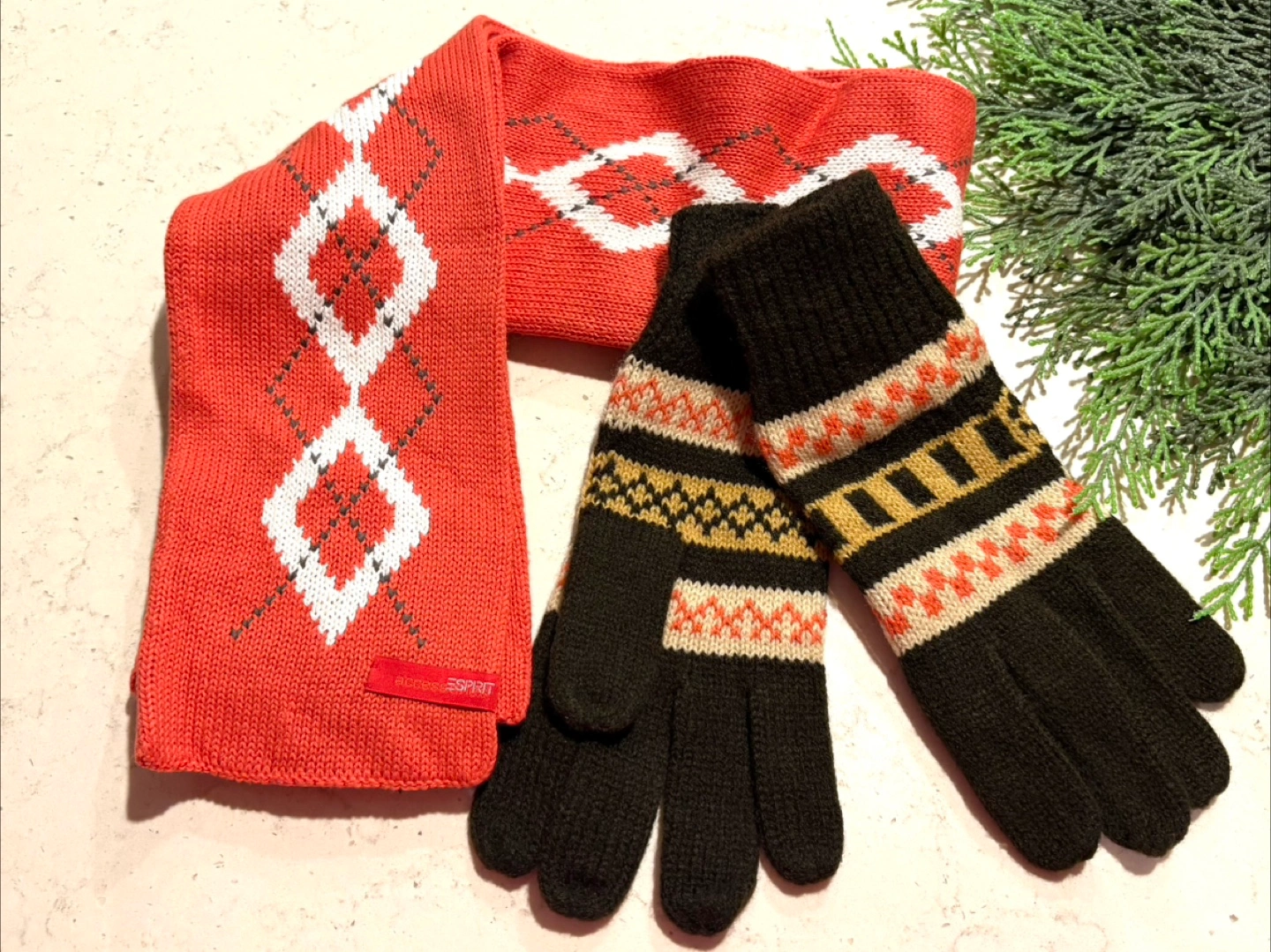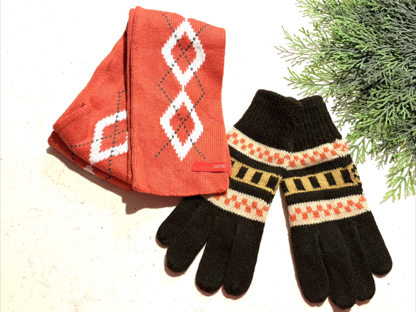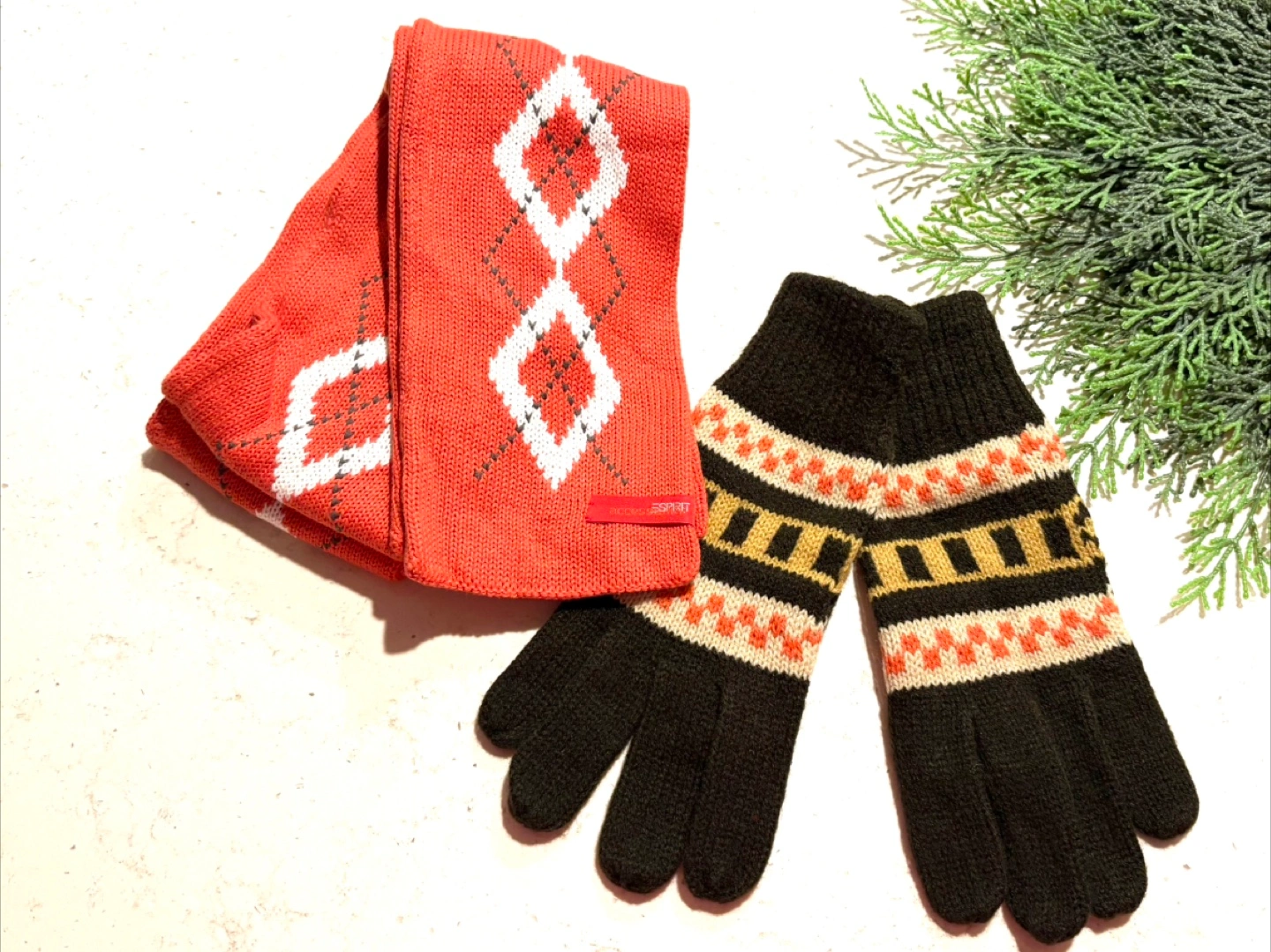The scarf features a classic argyle pattern, while the gloves have a unique geometric design.