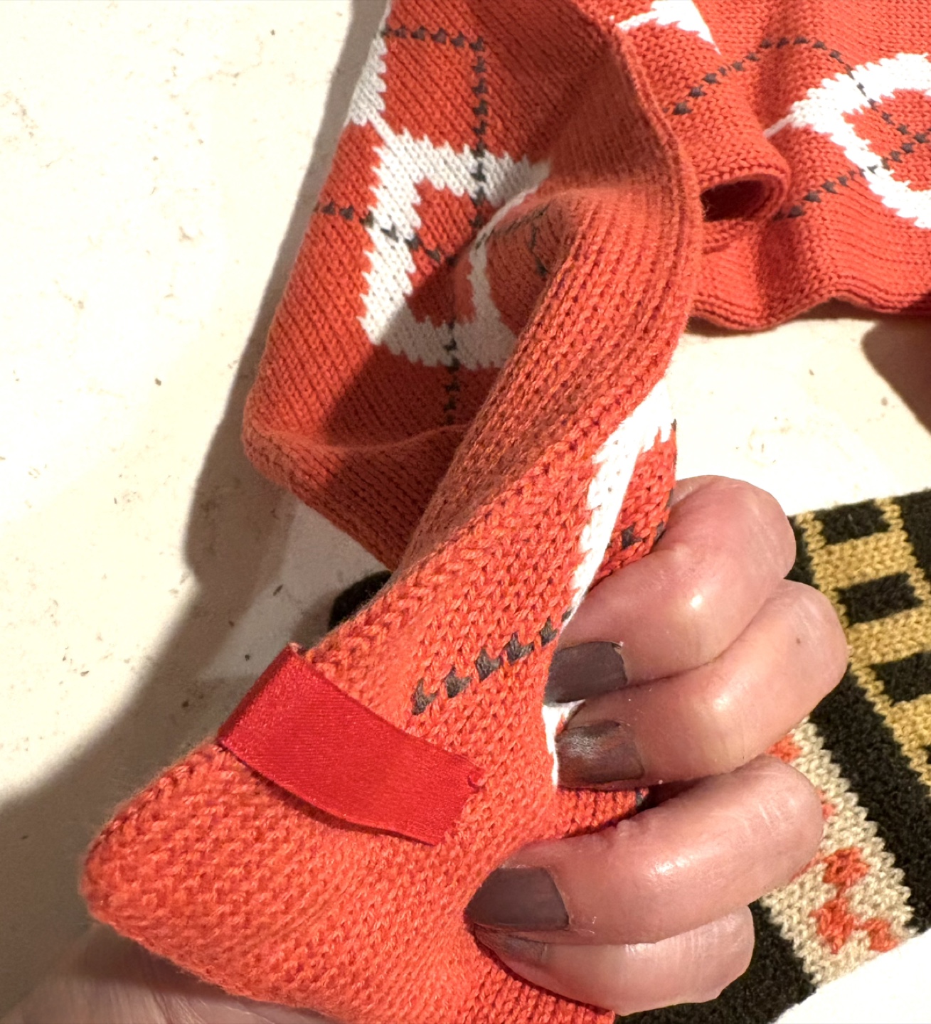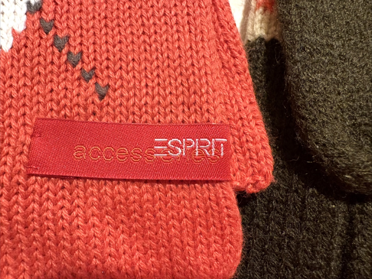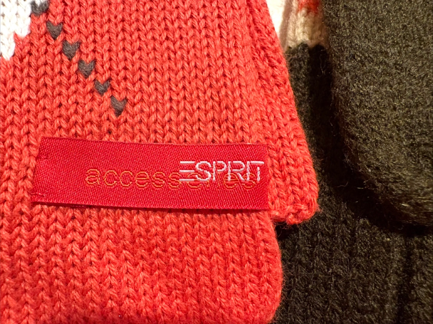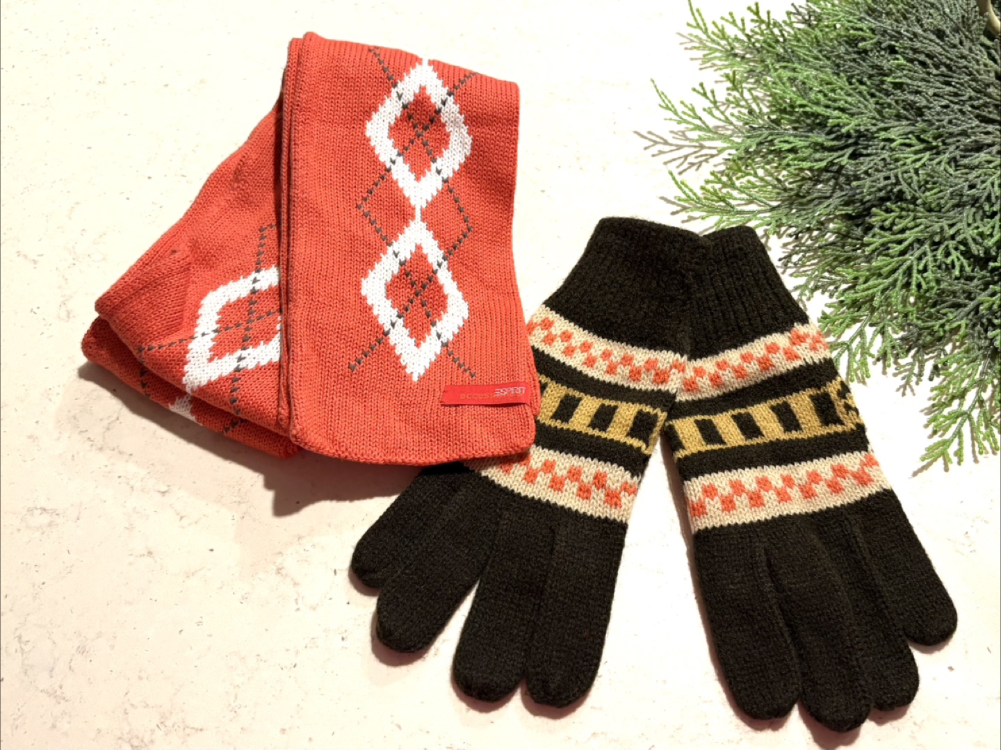 The scarf features a classic argyle pattern, while the gloves have a unique geometric design.