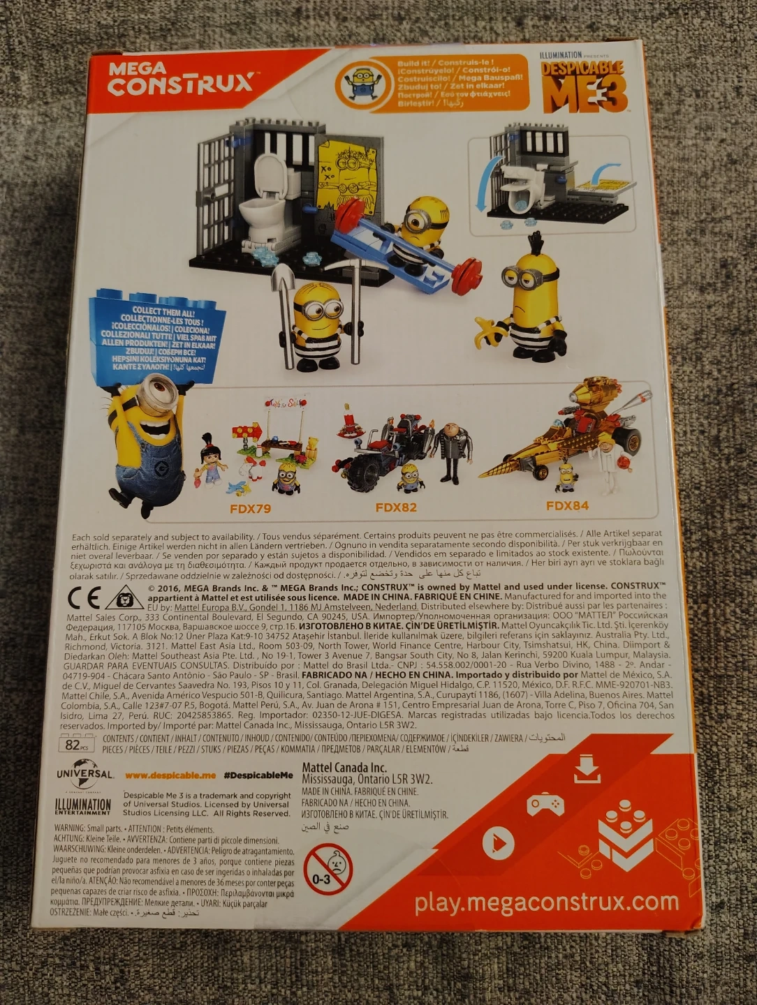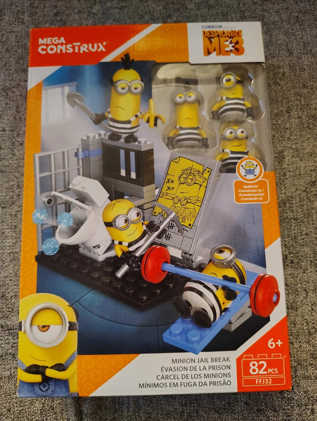 Inspired by the new Despicable Me 3 movie! Buildable prison cell with action-reaction bench press, toilet that spills, and poster that hides secret passageway escape exit Accessories include mining tools and barbell Three buildable Minion figures in prison outfits with interchangeable parts, including overalls, goggles, arms and feet Mix and match Minion clothing and accessories to customize your collectible characters