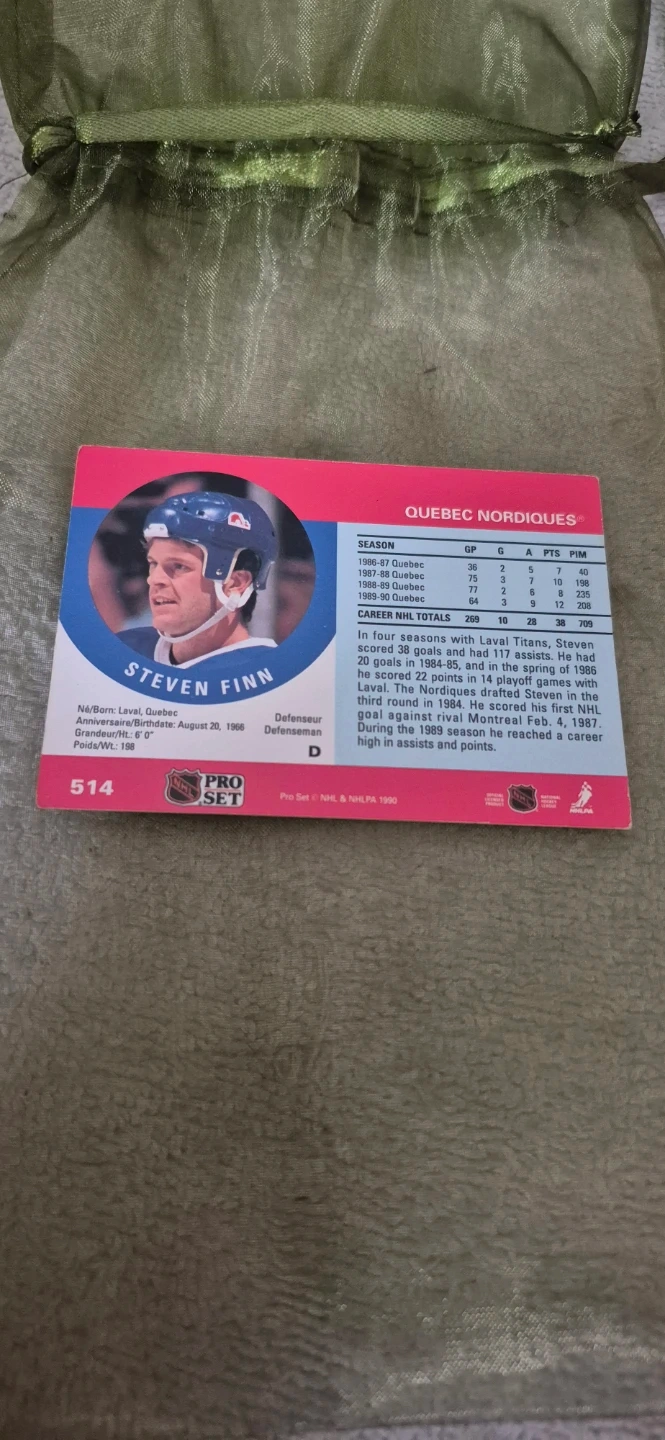Selling a Steven Finn hockey card from his time with the Quebec Nordiques. It's a Pro Set card, number 514. A great addition to any hockey card collection!
