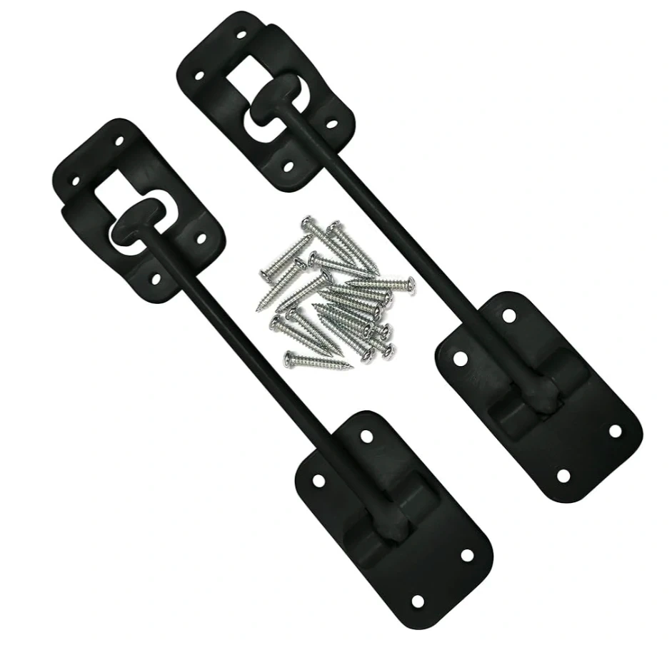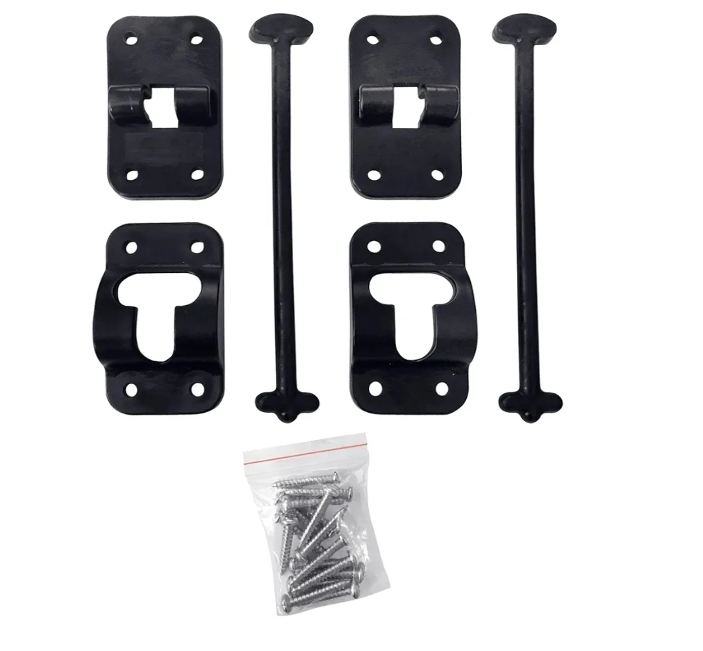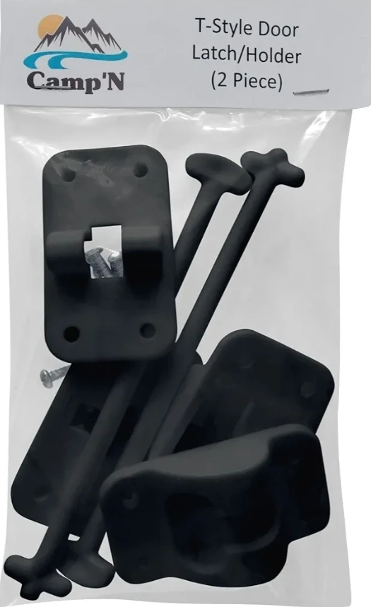 Here's a Camp'N T-Style Door Latch/Holder set. Includes two latches and a bag of screws. Each latch measures approximately 2 7/8" x 1 3/4".