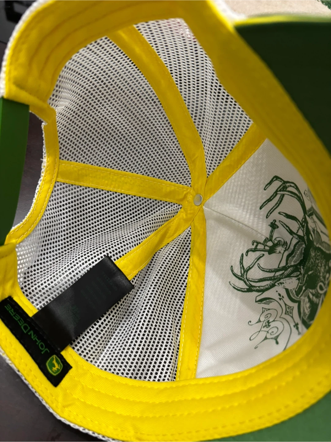 Selling a John Deere trucker hat in great condition! It's green and yellow with a mesh back. Perfect for any John Deere fan!