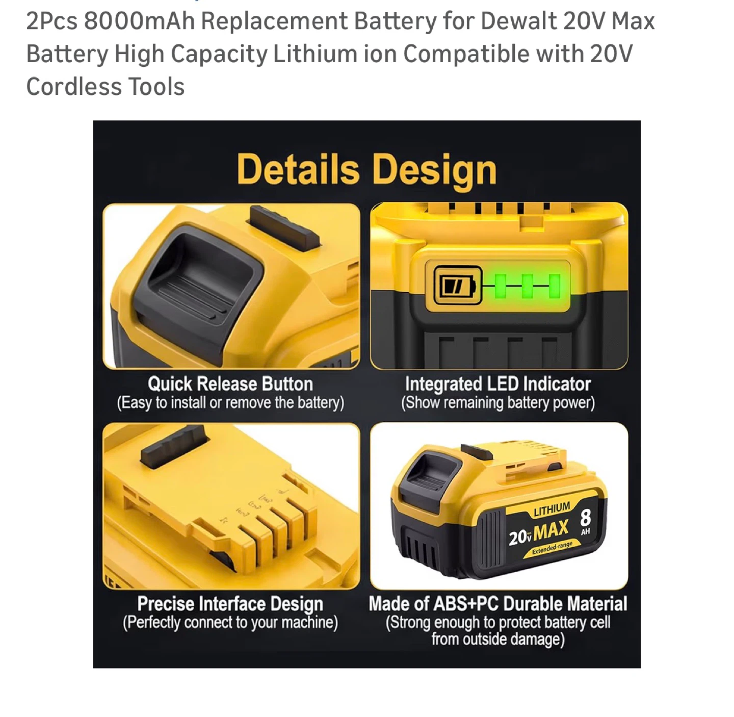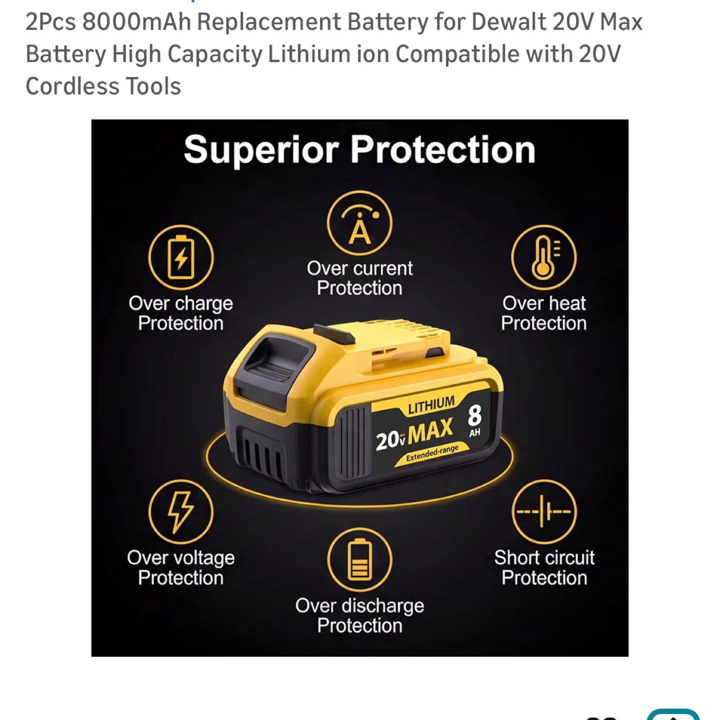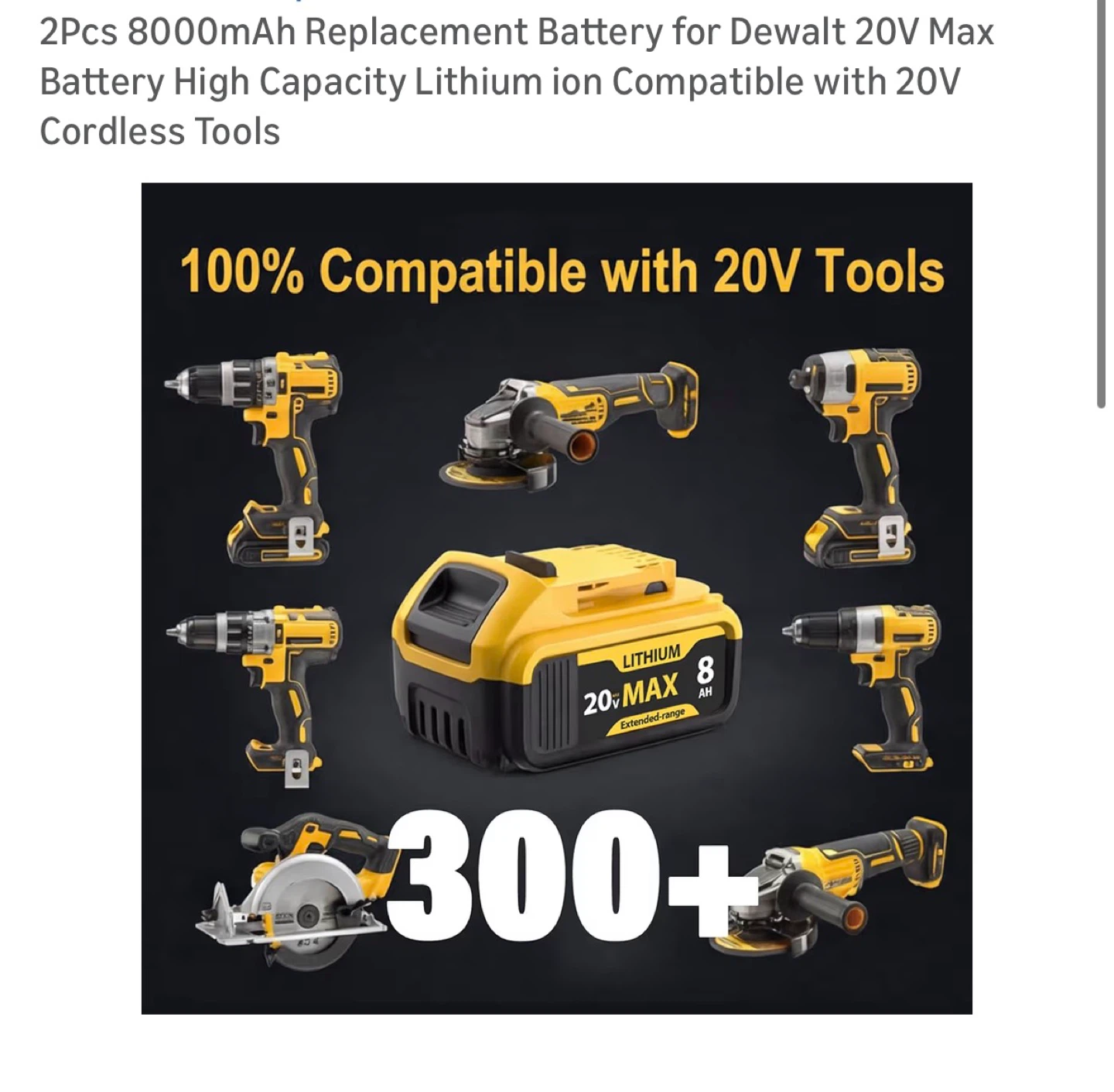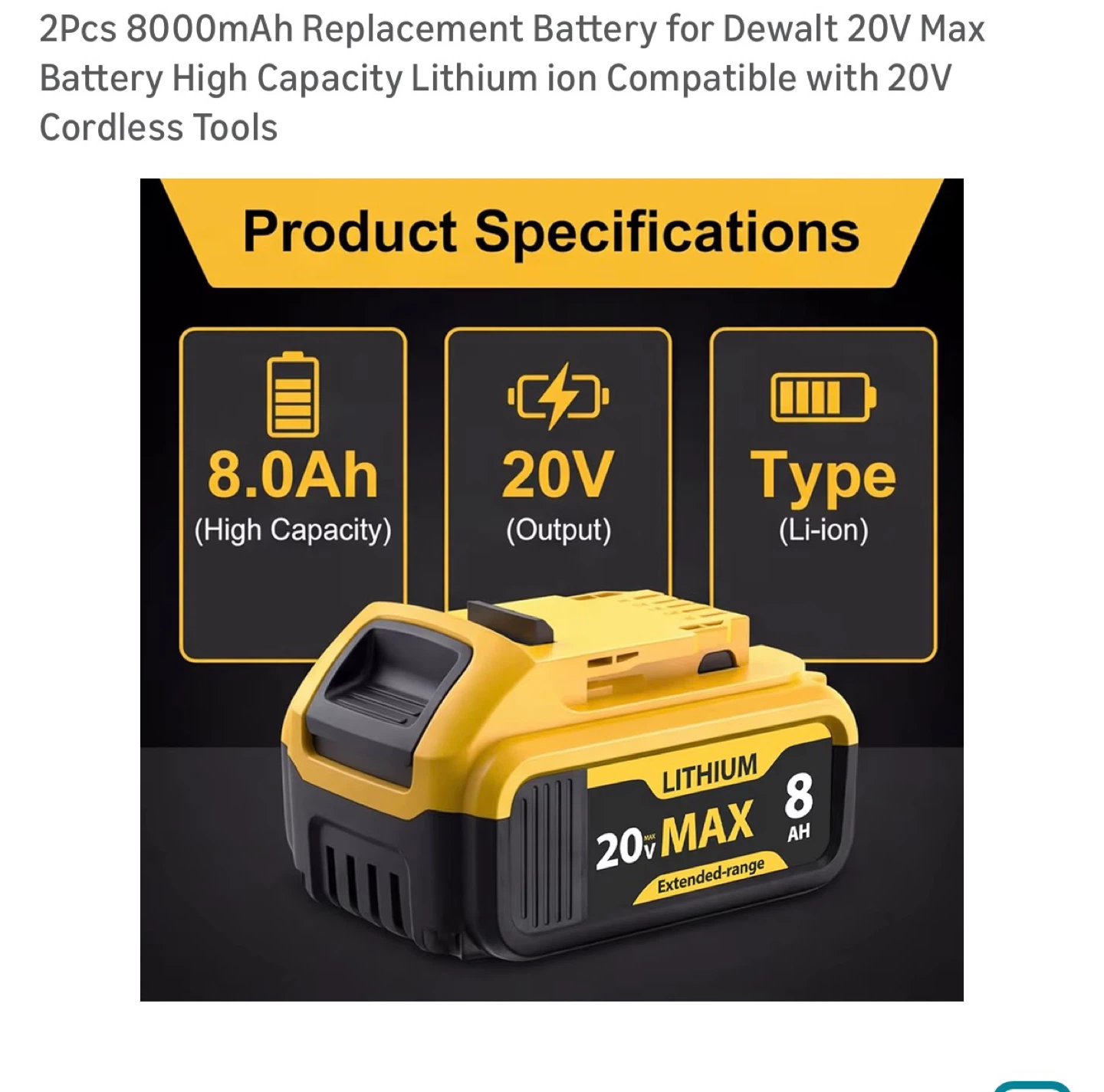 Buy & SellDewalt 20V Max 8000mAh Replacement BatteryDewalt 20V Max 8000mAh Replacement Battery$402Pcs 8000mAh Replacement Battery for Dewalt 20V Max Battery High Capacity Lithium ion Compatible with 20V Cordless Tools Brand new in boxConditionNewBrandDewaltWHERE TO MEETPio pio 8View MapSELLERverifiedFrancesHell's Kitchen23117 reviews3 chats·2 favorites·32 viewsSEND CHAT TO SELLERHi Frances! I’m interested in your listing.Hi Frances! I’m interested in your listing.Get the Karrot app to chatSign In to chat