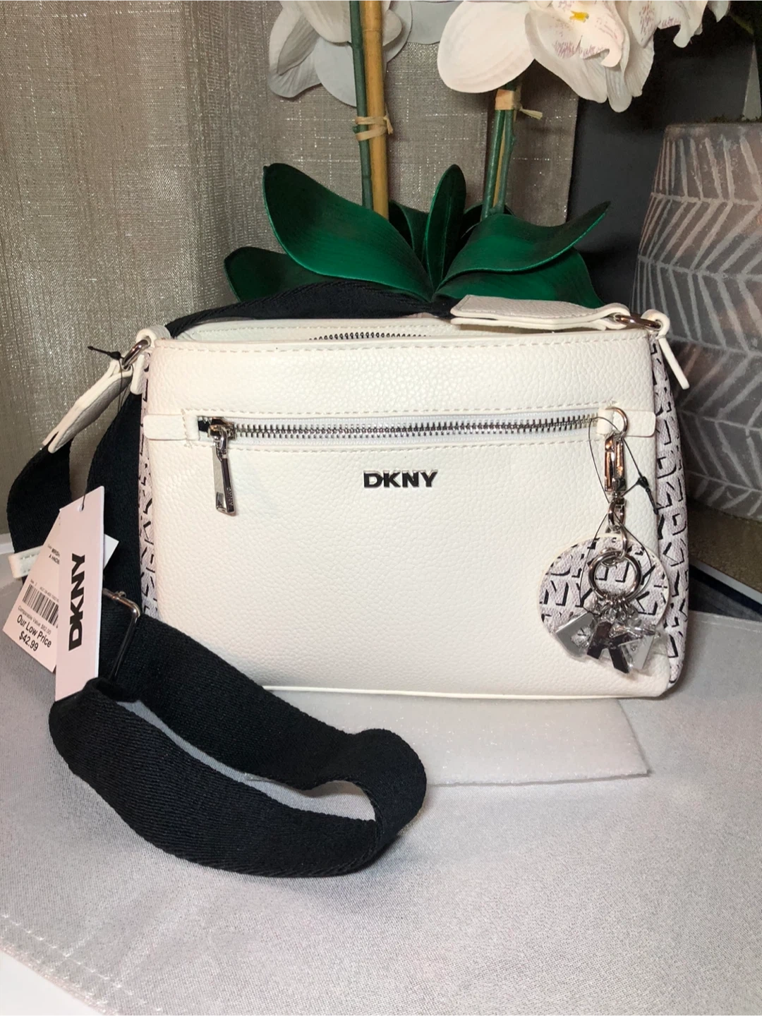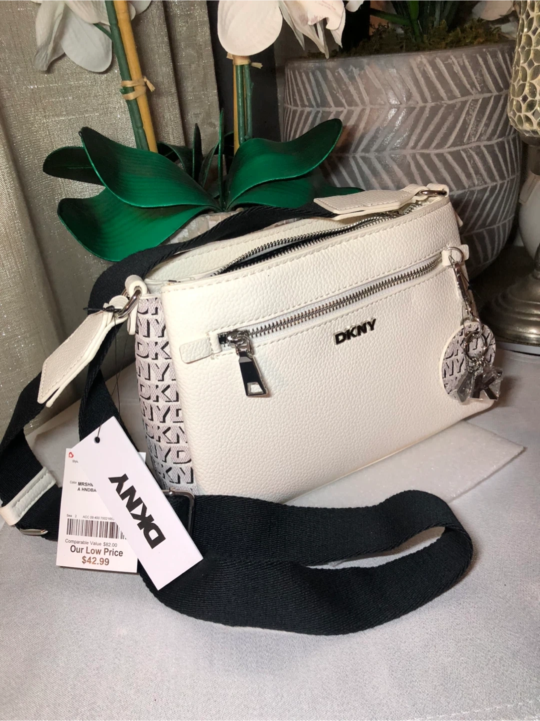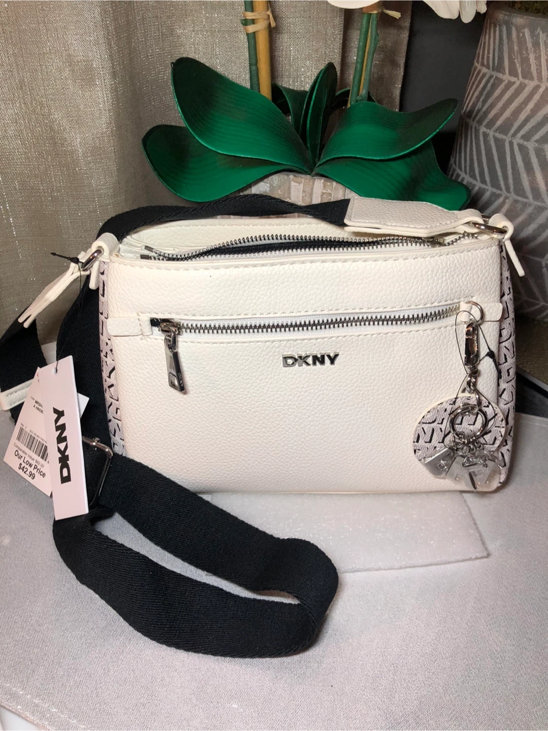 This is a brand new DKNY crossbody bag with the tags still attached! It's white with a black strap and DKNY logo details. The tag shows it was originally $42.99. Perfect for everyday use!