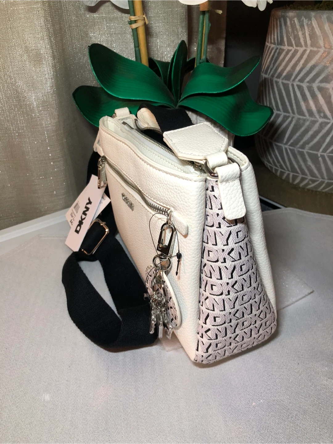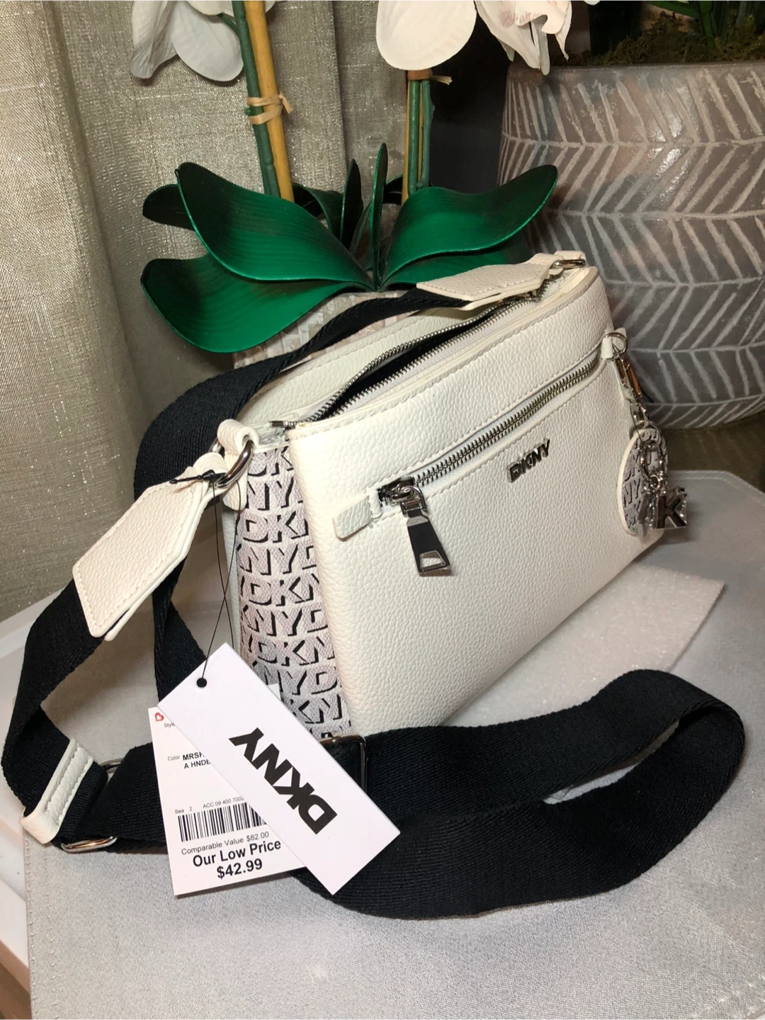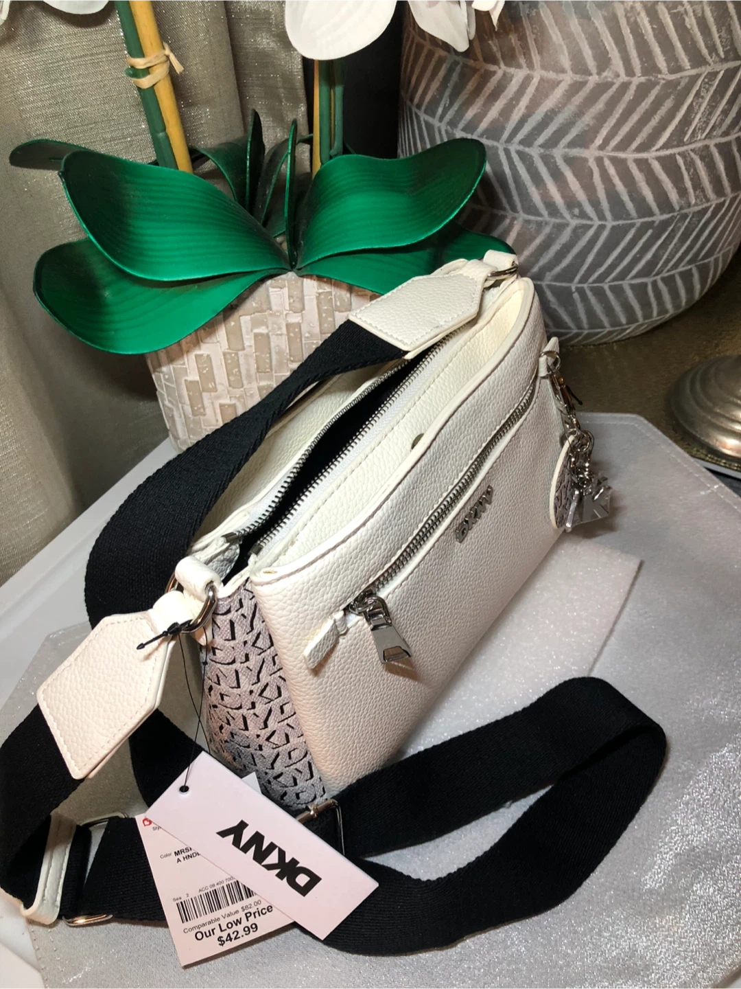 This is a brand new DKNY crossbody bag with the tags still attached! It's white with a black strap and DKNY logo details. The tag shows it was originally $42.99. Perfect for everyday use!