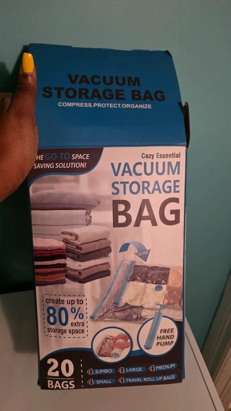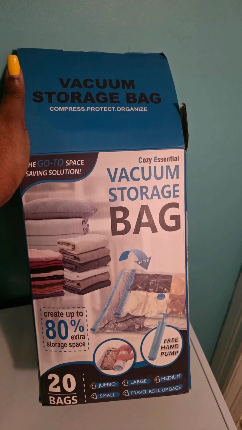Get organized with this set of vacuum storage bags. Different sizes. They're a cozy essential for saving space. The box includes a free hand pump to help you compress everything down. Create up to 80% extra storage space. Open and use about 2 bags