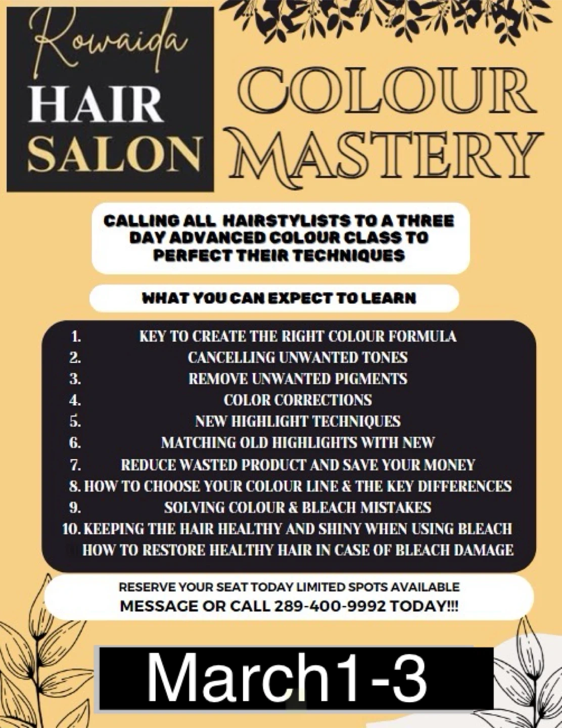 Calling all hairstylists! This is an advertisement for a three-day advanced colour class to perfect your techniques at Rowaida Hair Salon. Learn key skills such as creating the right colour formula, cancelling unwanted tones, removing unwanted pigments, and performing colour corrections. You'll also learn new highlight techniques and how to match old highlights with new ones. Plus, you'll learn how to reduce wasted product and save money, how to choose your colour line, solve colour and bleach mistakes, and keep hair healthy and shiny when using bleach. You'll also learn how to restore healthy hair in case of bleach damage. Reserve your seat today!