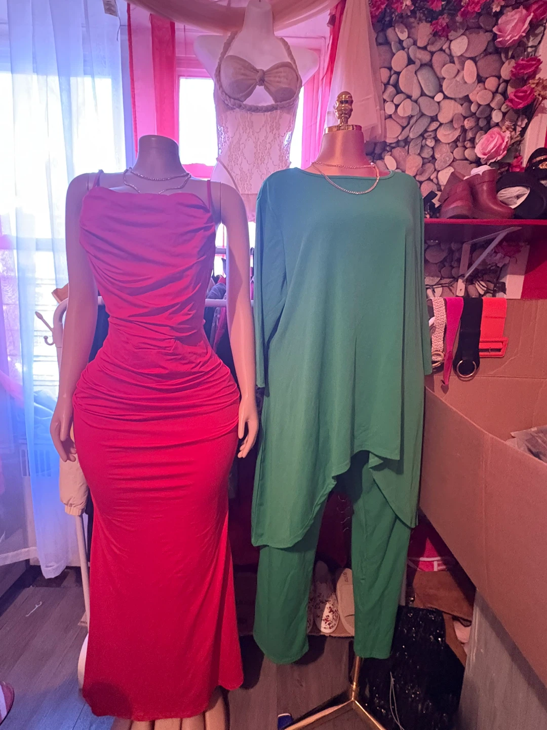 Selling a red dress and a green pants set! Both are in great condition and ready for a new wardrobe. The dress is a vibrant red, and the pants set is a lovely green color. Perfect for adding a pop of color to your outfits!