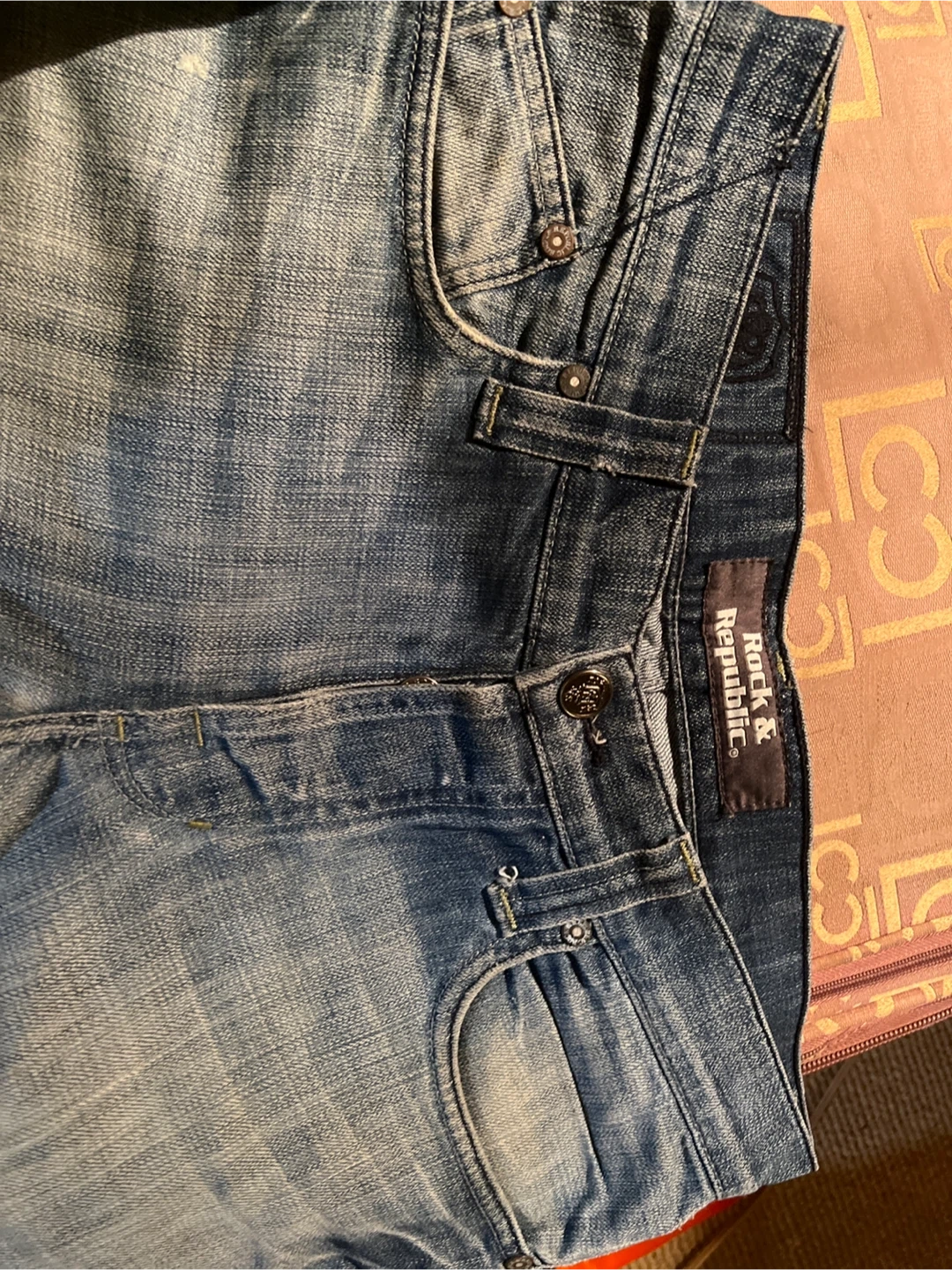 Selling a pair of Rock & Republic denim jeans. These jeans feature a stylish design and are in good condition. Perfect for adding a touch of edge to your wardrobe!