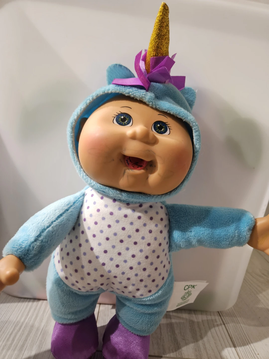 Selling a cute Cabbage Patch Kids doll dressed as a unicorn! It's in great condition and ready for a new home. The doll features a blue unicorn outfit with purple accents and a sparkly gold horn.