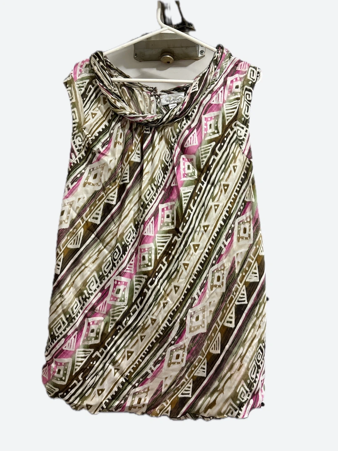 Here's a Dress Barn sleeveless blouse It features a unique geometric pattern in shades of brown, pink, and white. Perfect for adding a touch of style to your wardrobe!