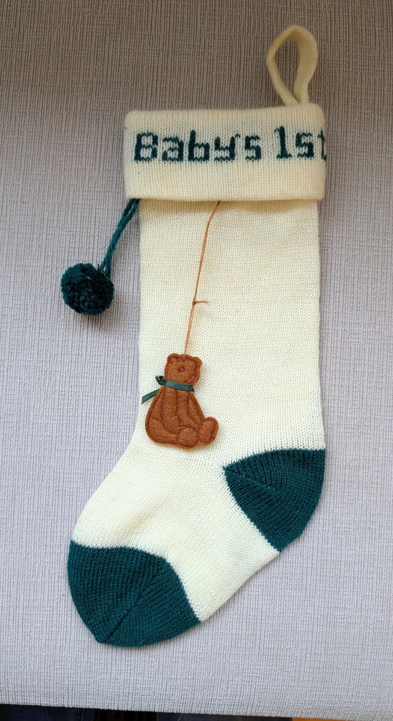 A sweet keepsake for a little one's first Christmas! This cream and green stocking features "Baby's 1st" on the cuff and a cute teddy bear applique. Perfect for hanging by the fireplace or adding a touch of holiday charm to the nursery