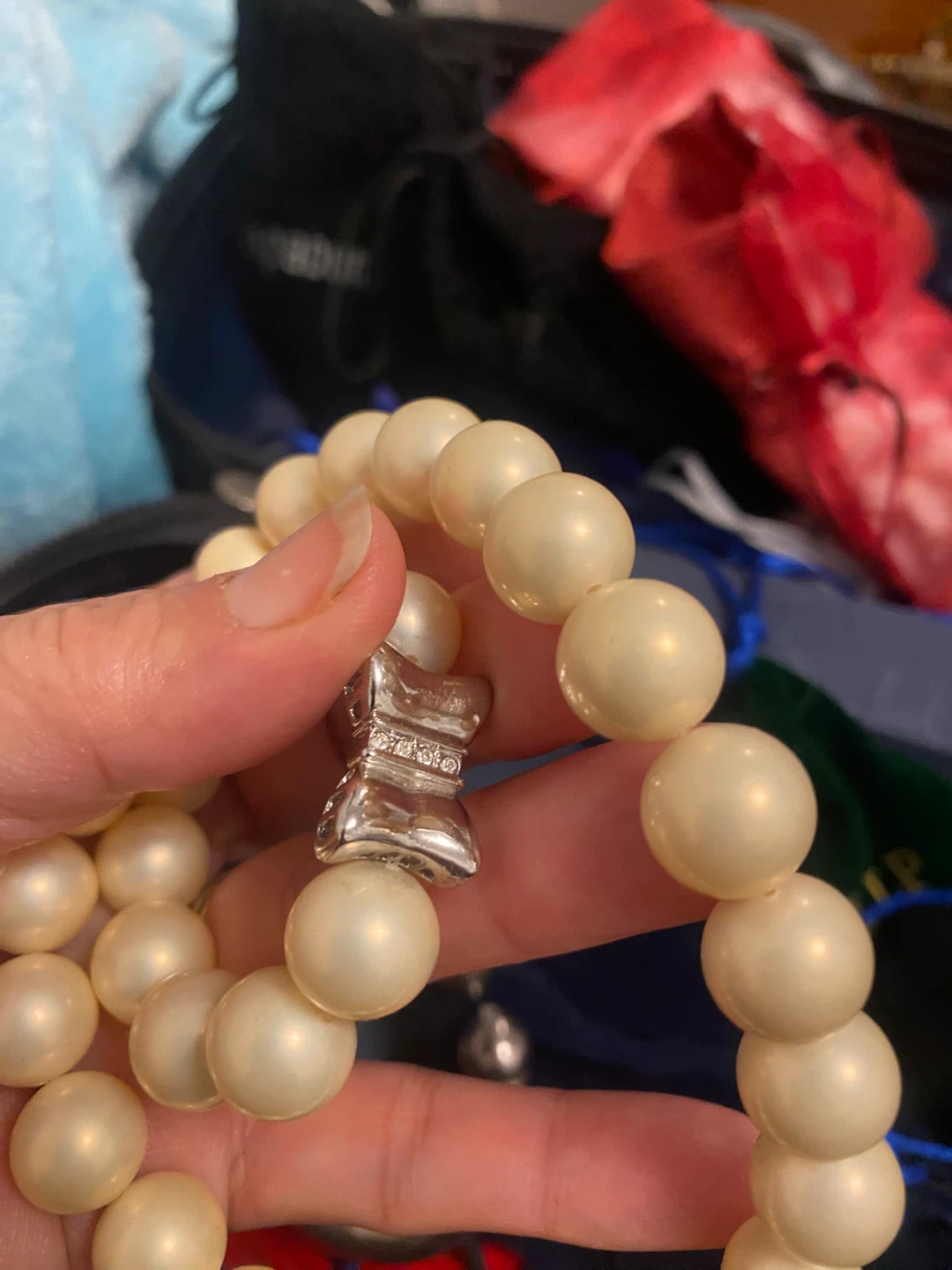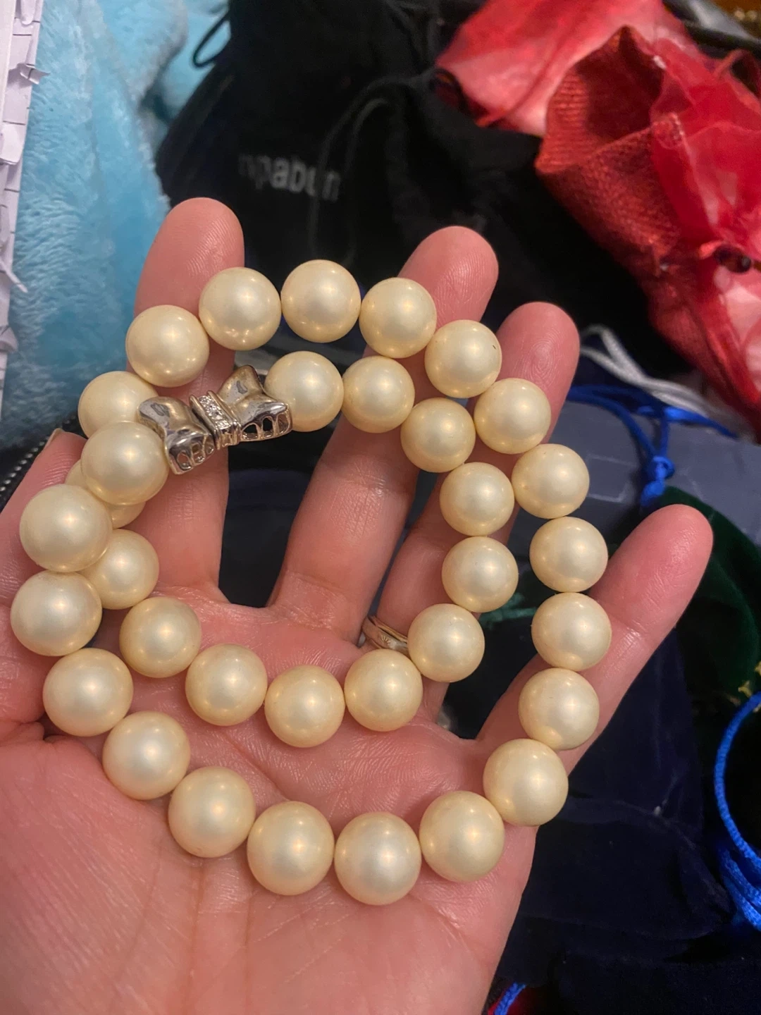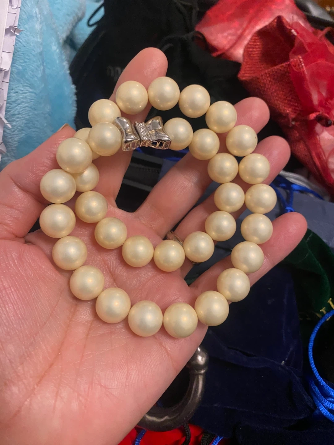 Here's a lovely pearl bead bracelet! The beads are a creamy, off-white colour, and the clasp is silver-toned with some small sparkly details. It's a beautiful piece to add to your collection