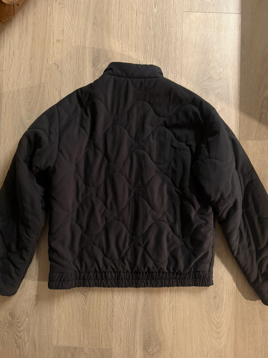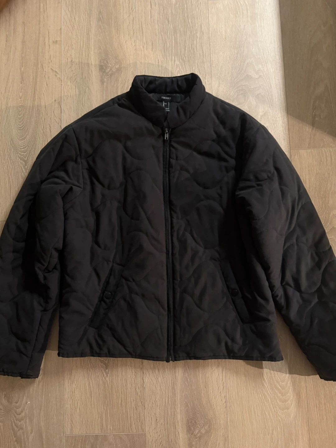 Selling a Forever 21 black quilted jacket in size large but would fit a medium better with a oversized fit. It's a stylish and cozy piece, perfect for layering during cooler weather. The jacket has a full zip and a comfortable fit and only worn few times, selling since im a student.
