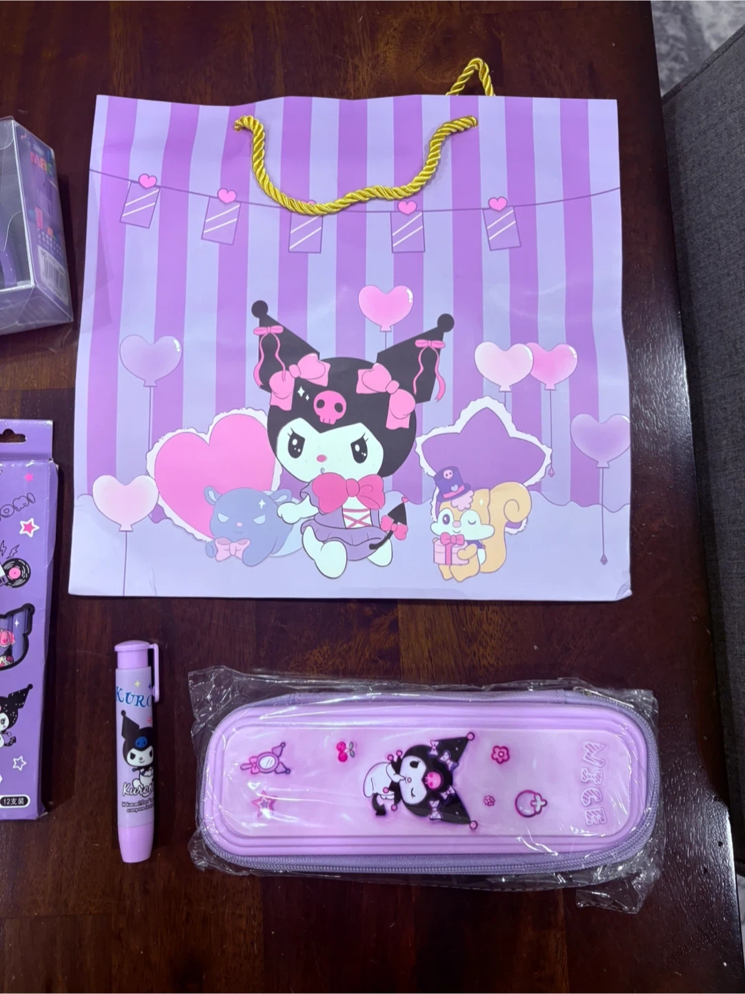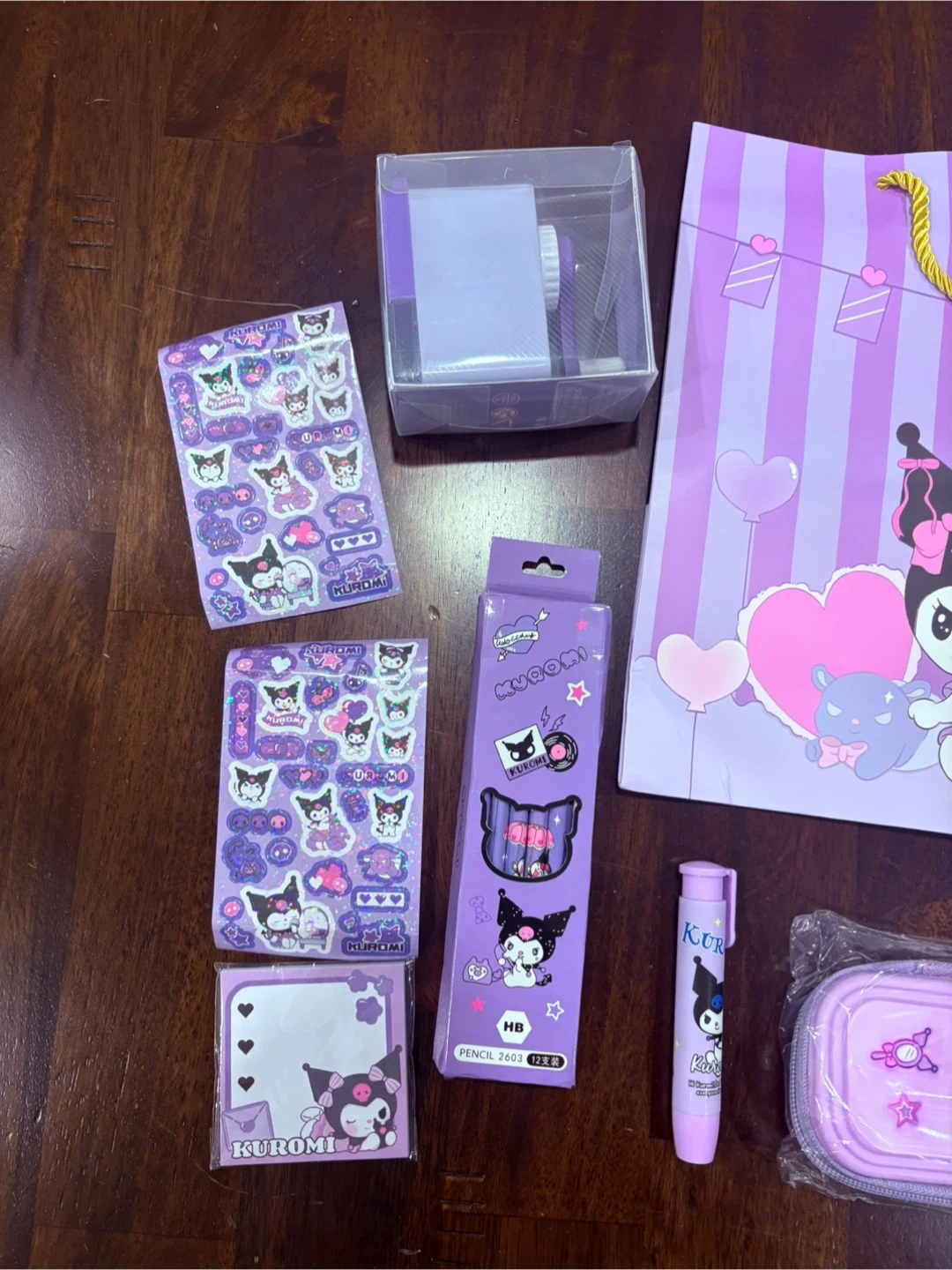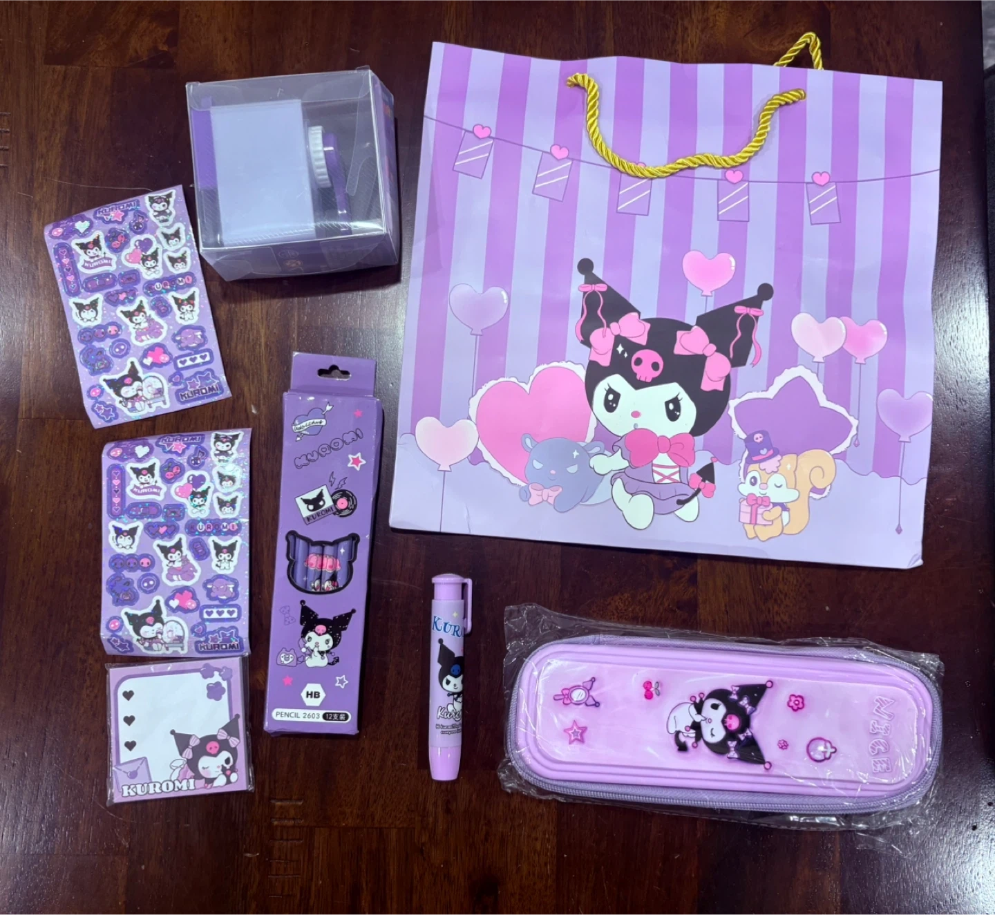 I have a new Kuromi stationery set for sale! It includes a bag, pencil case, pen, pencil set, stickers, sticky notes, and a pencil sharpener. The set is all in Kuromi's signature purple colour.