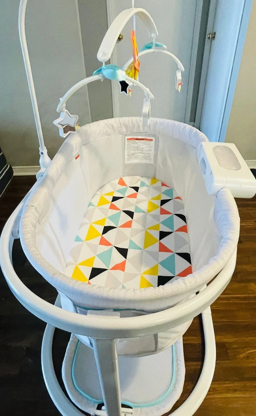 Selling a Fisher-Price Soothing Motions Bassinet in great condition! It's perfect for newborns and infants, providing a cozy and secure sleeping space. The bassinet features gentle rocking motions and soothing sounds to help your little one drift off to sleep. It also has a mobile with soft toys to entertain your baby. It's lightweight and easy to move around the house, so you can keep your baby close by wherever you are