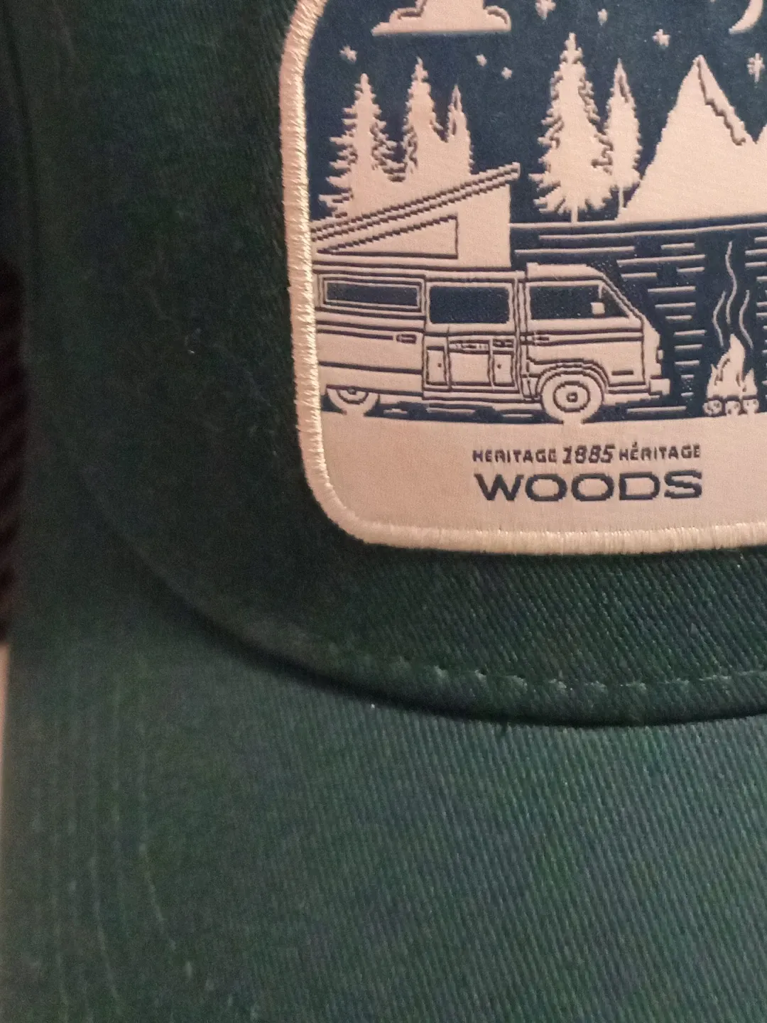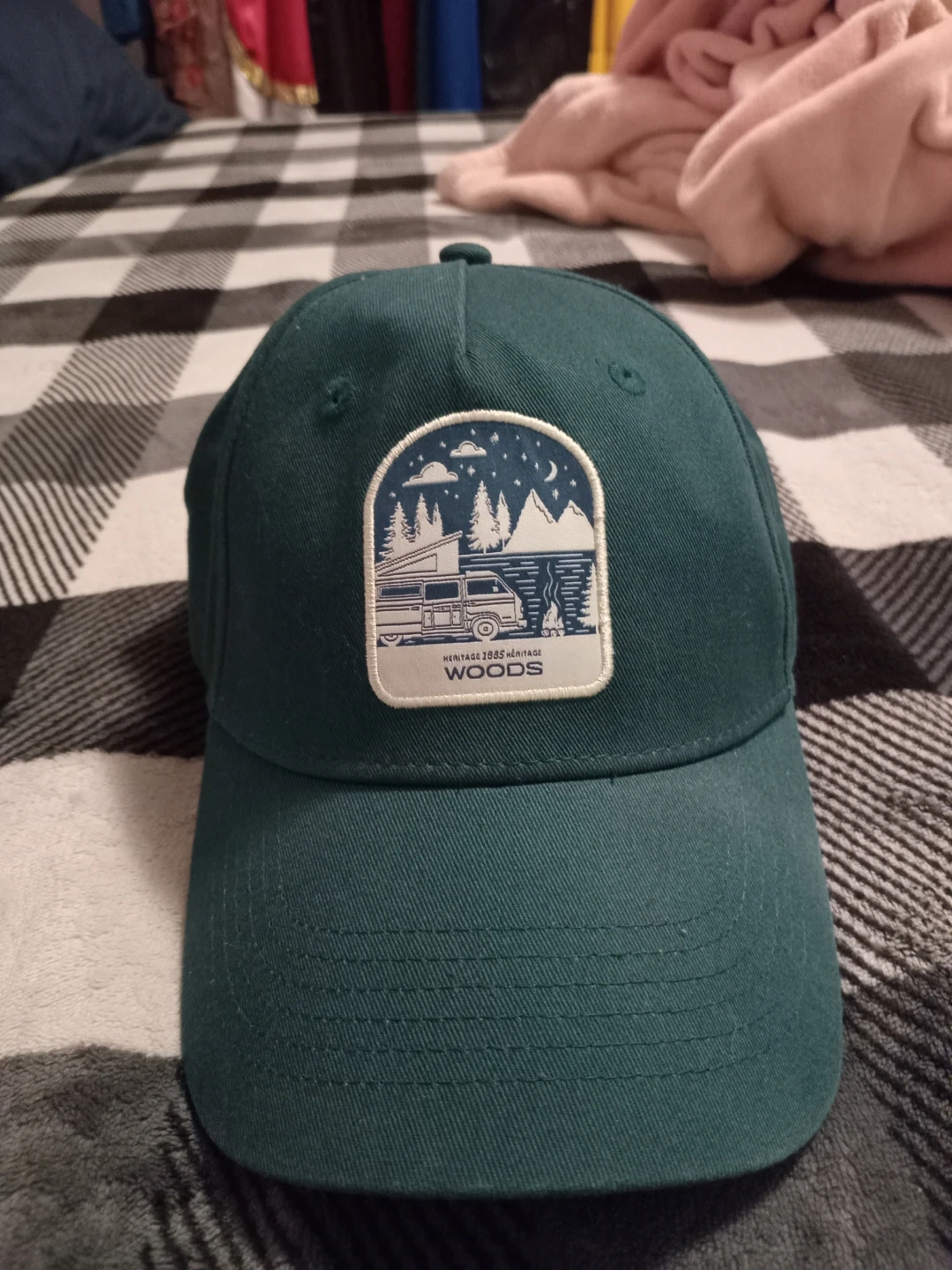 This is a Heritage Woods baseball cap in a nice green colour! It has a cool patch on the front with a camper van and trees. The back has an adjustable strap for a comfy fit. Perfect for camping or just adding a bit of outdoorsy style to your outfit. CASH ONLY
