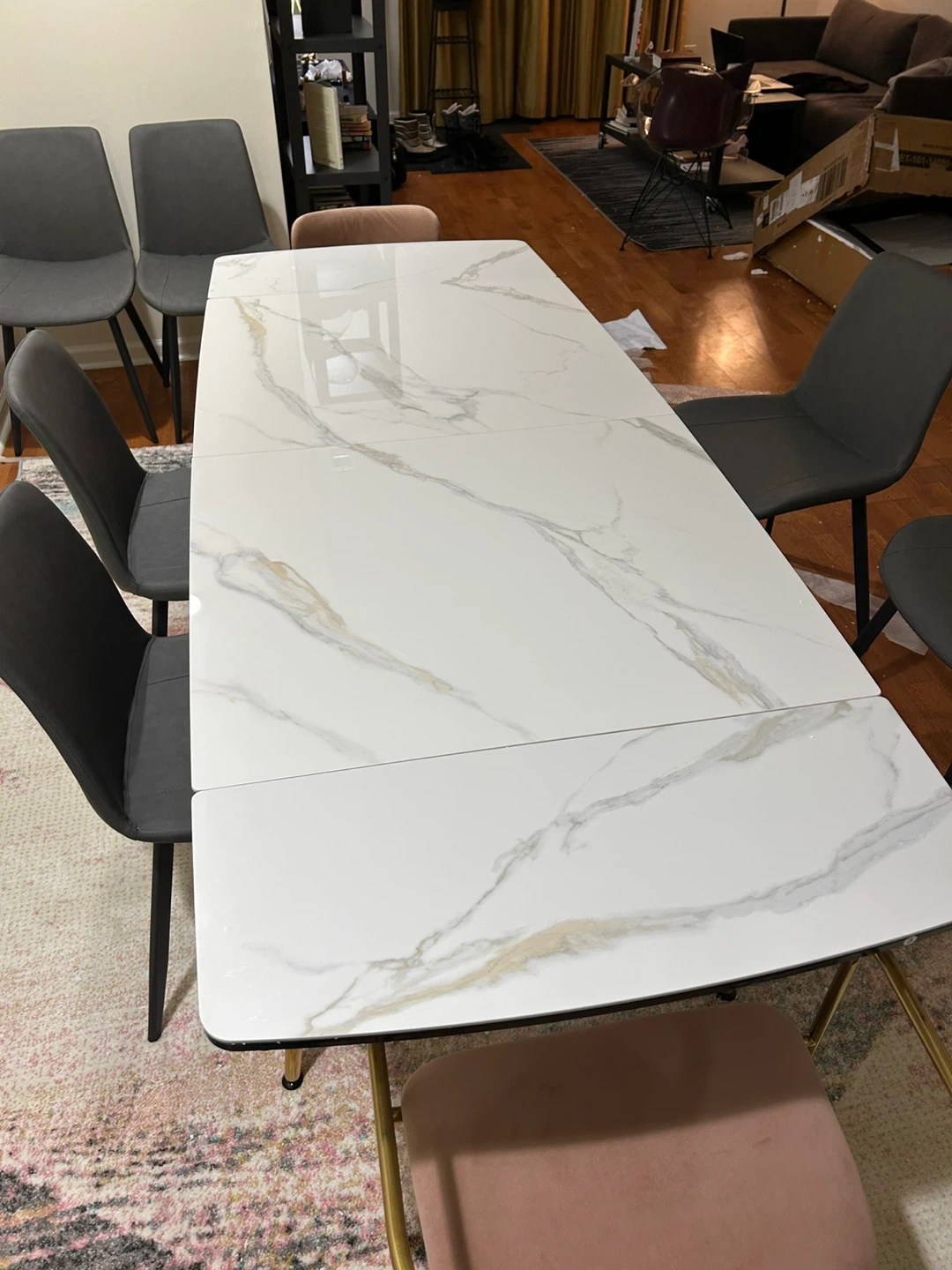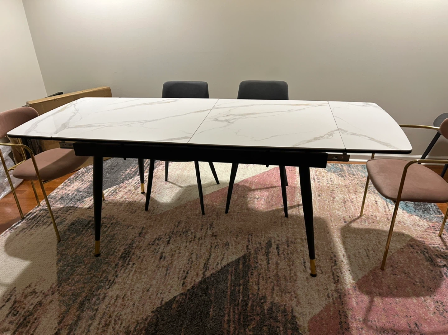 Elegant, modern extendable dining table with a white sintered stone top featuring a marble-inspired finish. The surface is scratch-, stain-, and heat-resistant, making it both beautiful and durable for everyday use or entertaining.