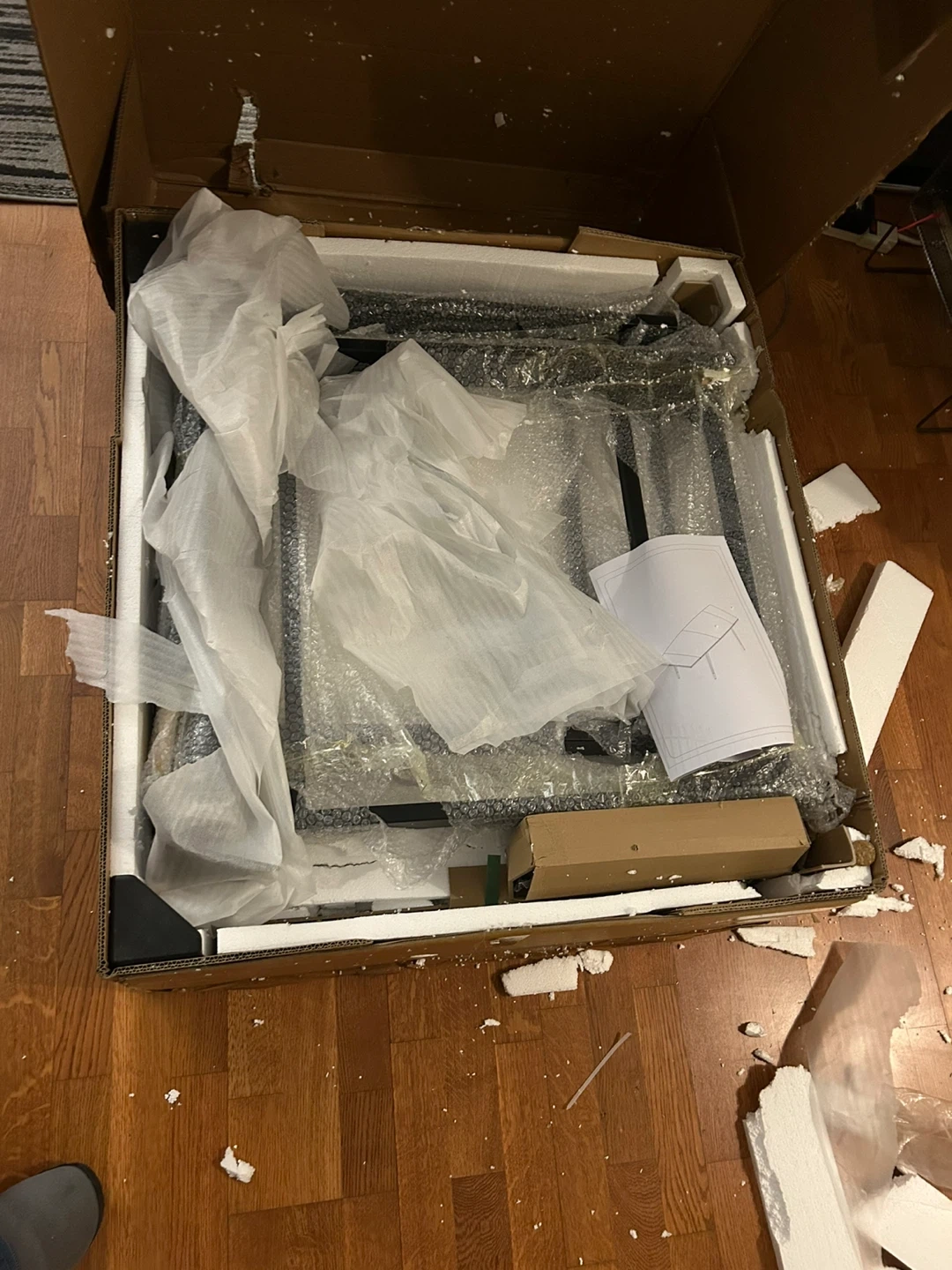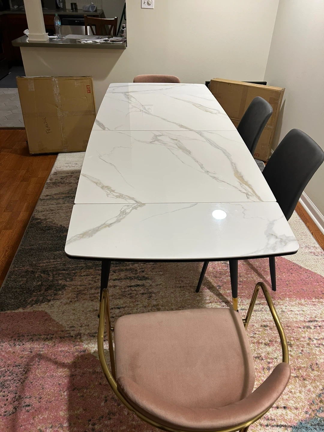 This listing is for a new, UNASSEMBLED table still in the original box. One extension leaf has a small chip (see photo). I originally purchased the table, requested a replacement for the chipped leaf, and received a full replacement from the manufacturer. I switched out the chipped leaf and am selling this unused table in the box as I do not need two. The assembled photos are for reference only so you can see how the table looks once set up. Chairs not included.