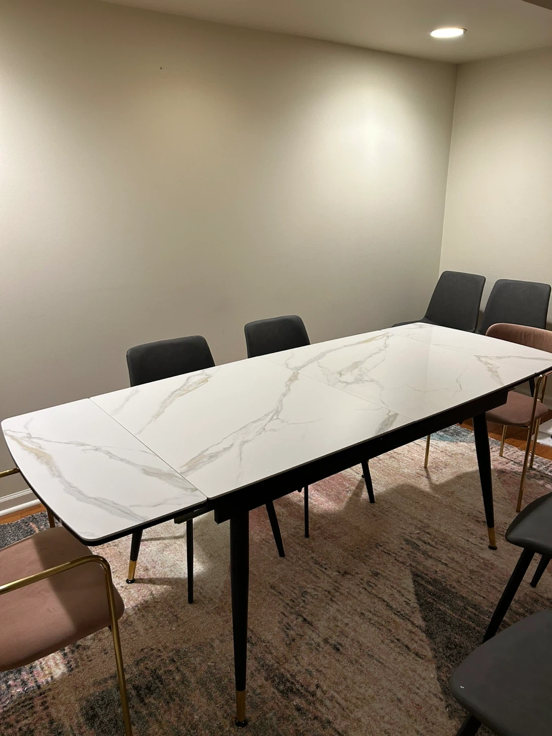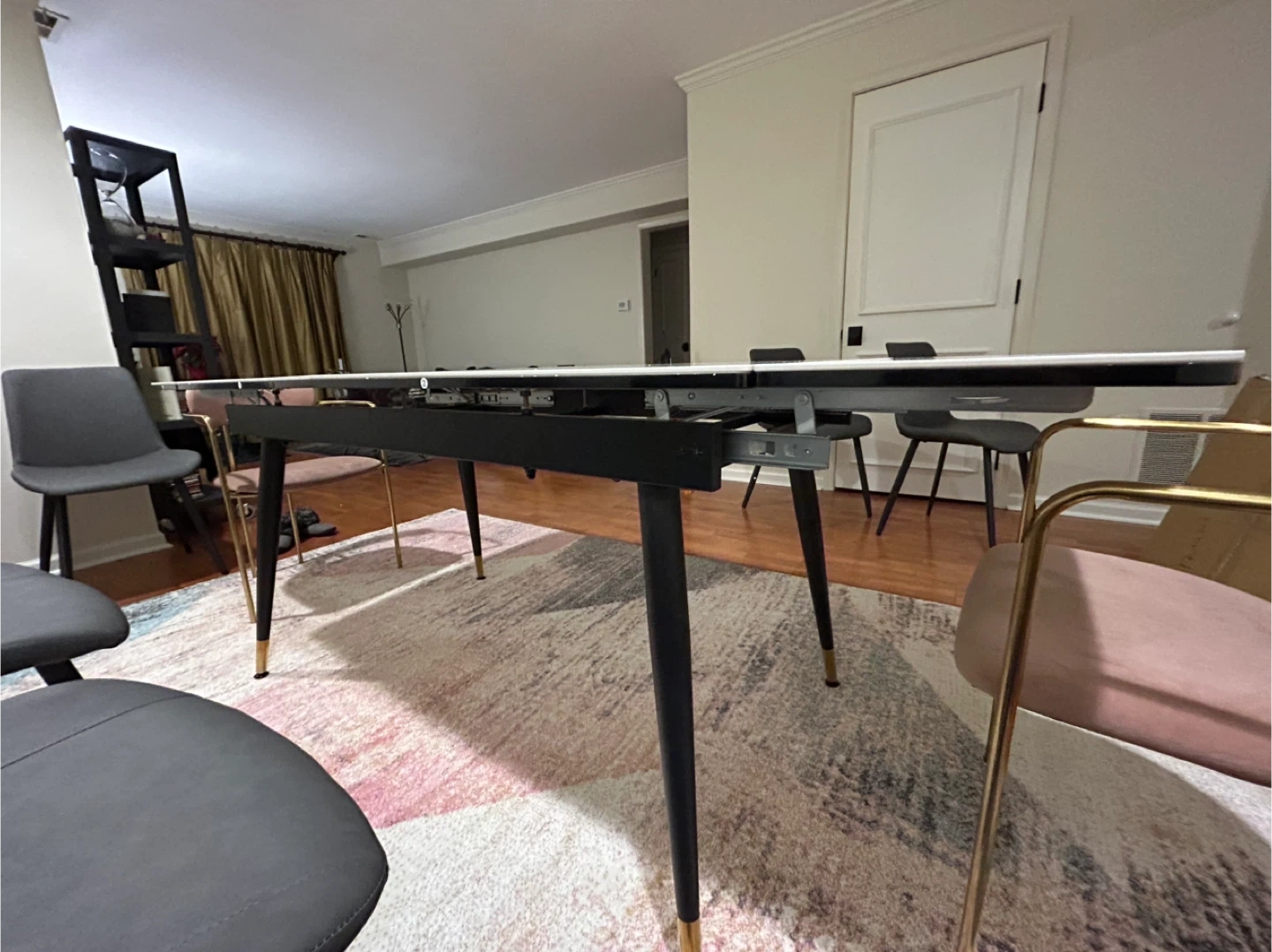 The table easily extends from 55" to 79", comfortably seating 4–8 people. It features a sturdy black plated metal base, supports up to 350 lbs, and is standard 30" dining height. All tools for assembly are included.