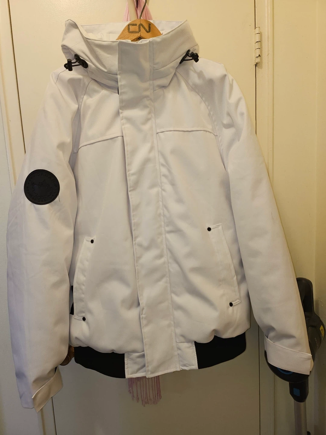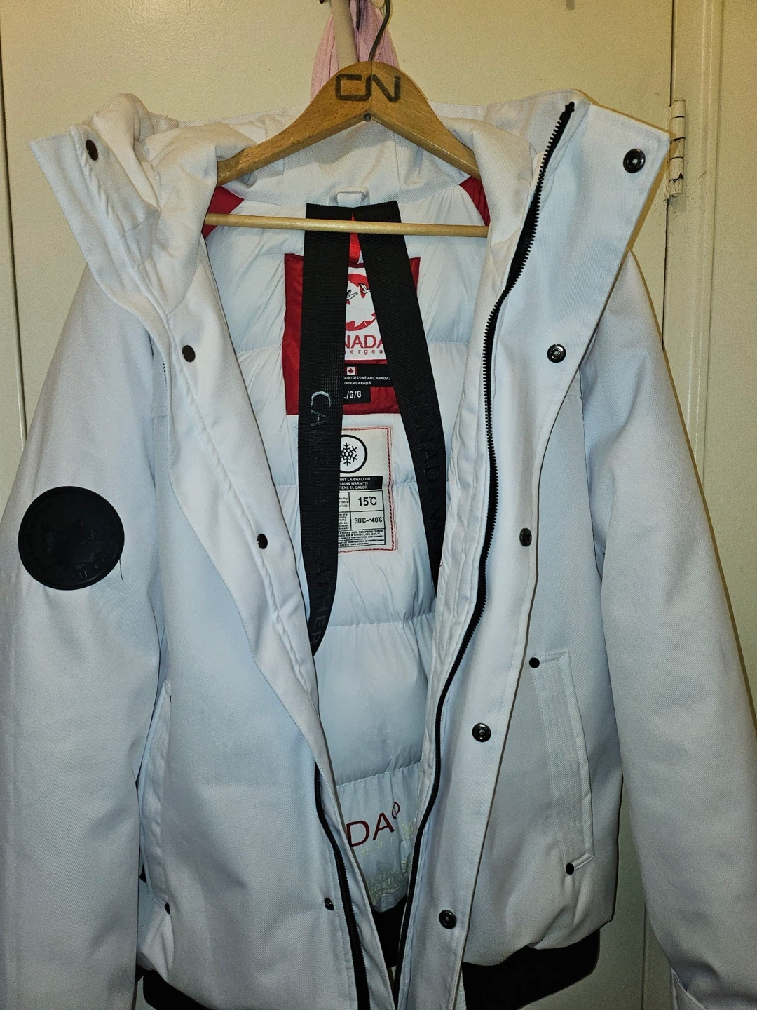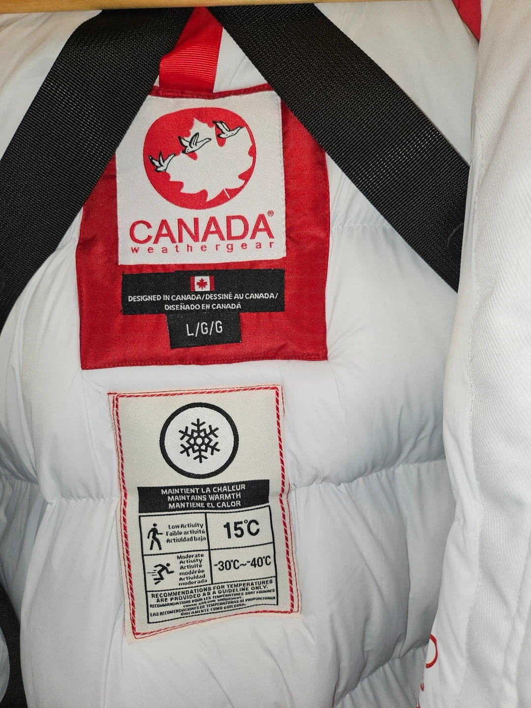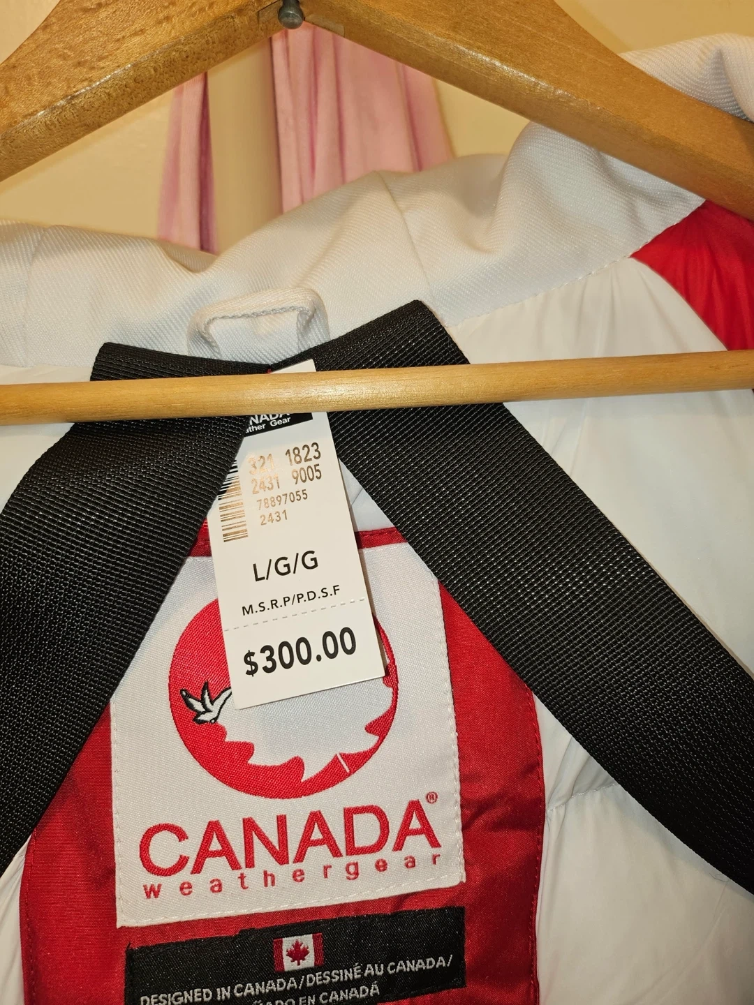 Selling a Canada Weathergear puffer jacket in white, size large. It's designed in Canada and can handle temperatures down to -40°C. The jacket is in great condition and originally retailed for $300!