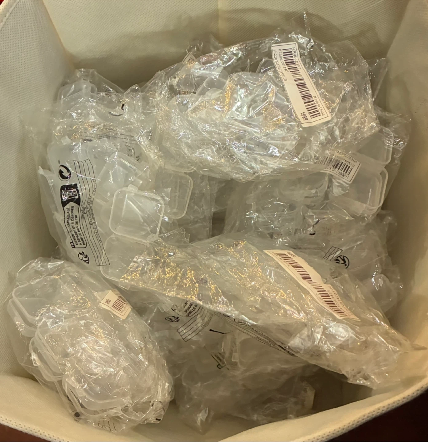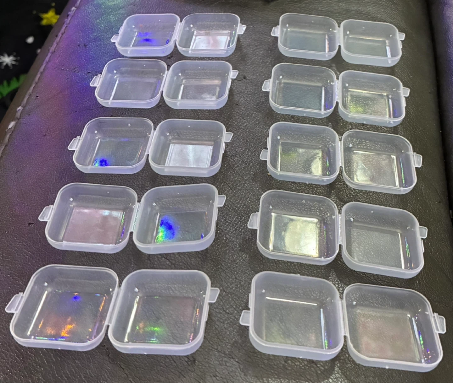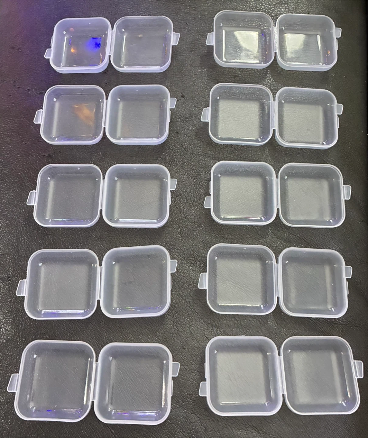 I have small, clear plastic storage containers. They're perfect for organizing small items like beads, jewelry, or craft supplies. They are new and ready to use! Each pack has 10. $2 each pack.