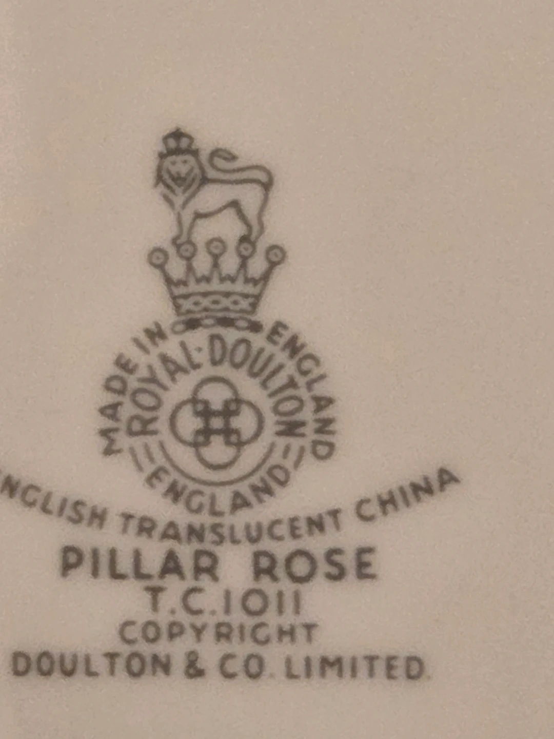 Selling a beautiful china set that includes pieces from Crown Regent and Royal Doulton. The Crown Regent pieces are fine porcelain made in Romania. One of the Royal Doulton patterns is Pillar Rose T.C.1011. It's a lovely collection!
