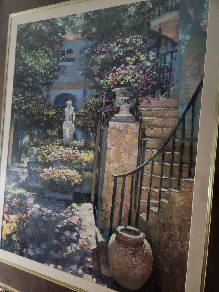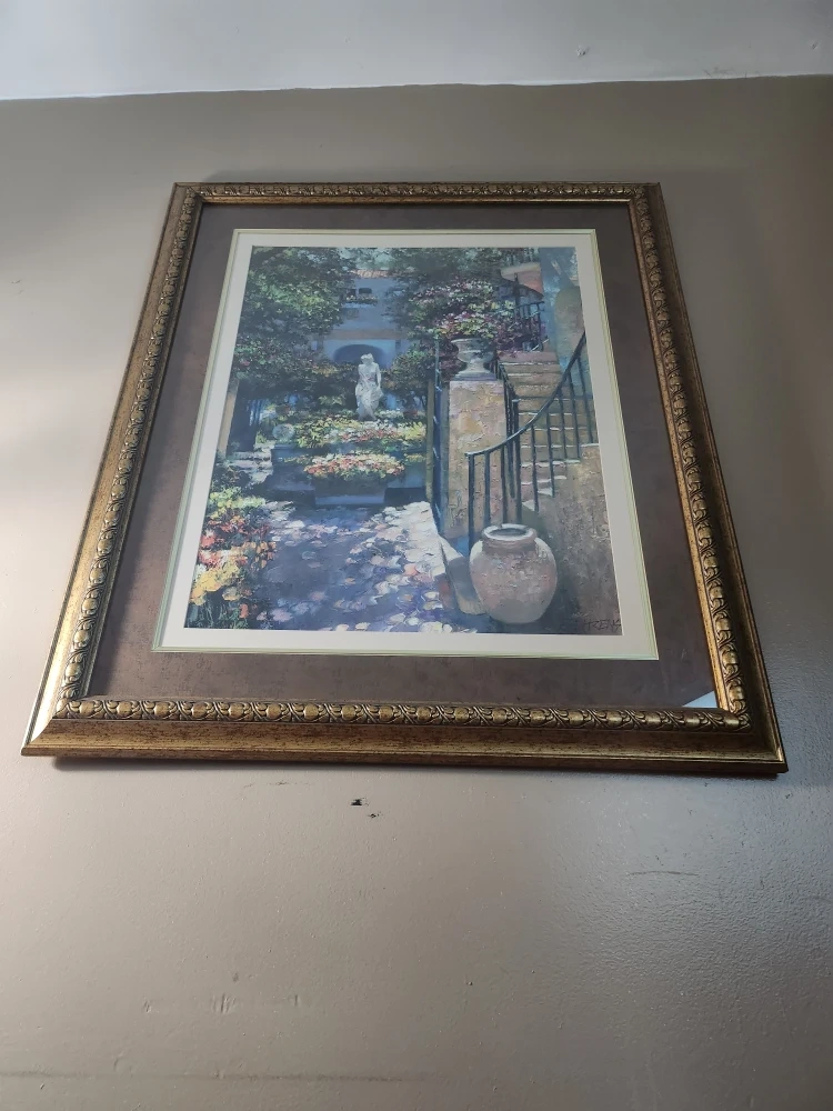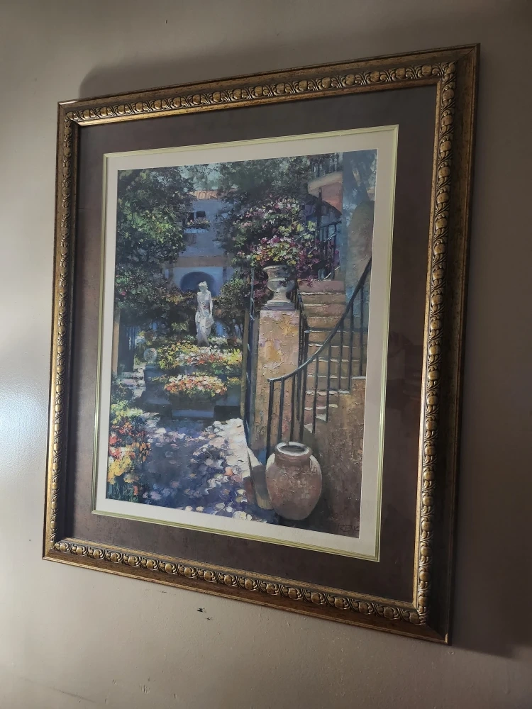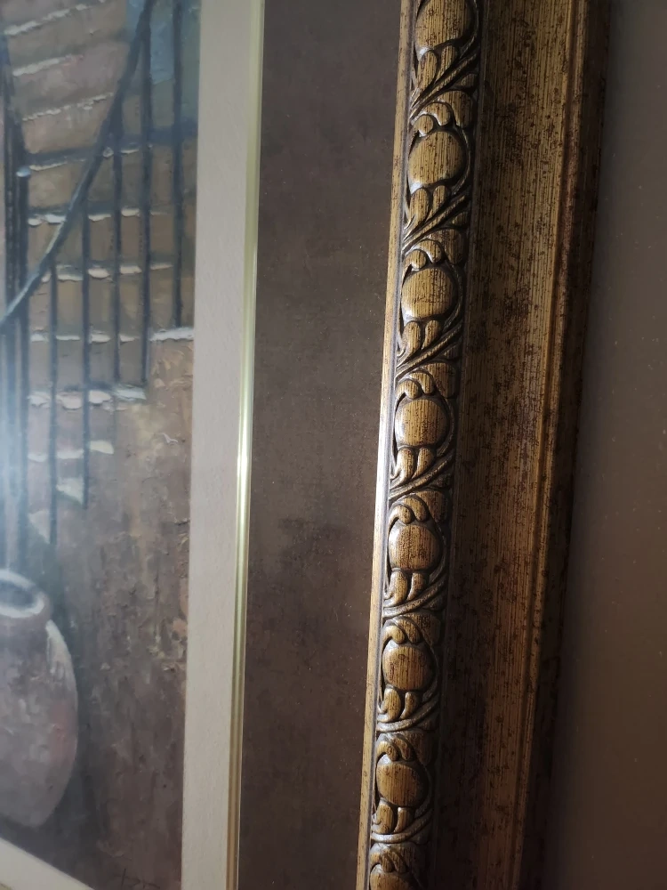 Type: Framed art print with a heavy, ornate, gold-toned frame and double matting