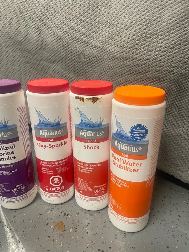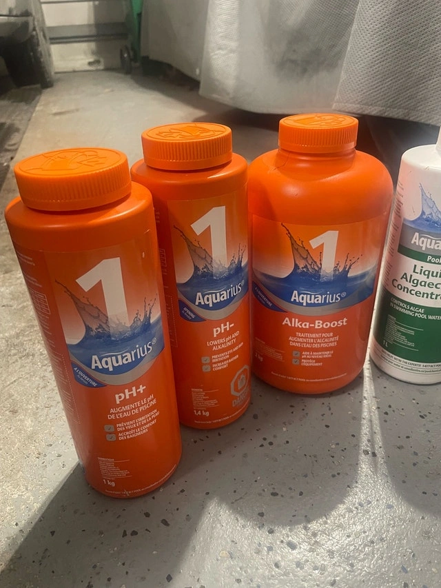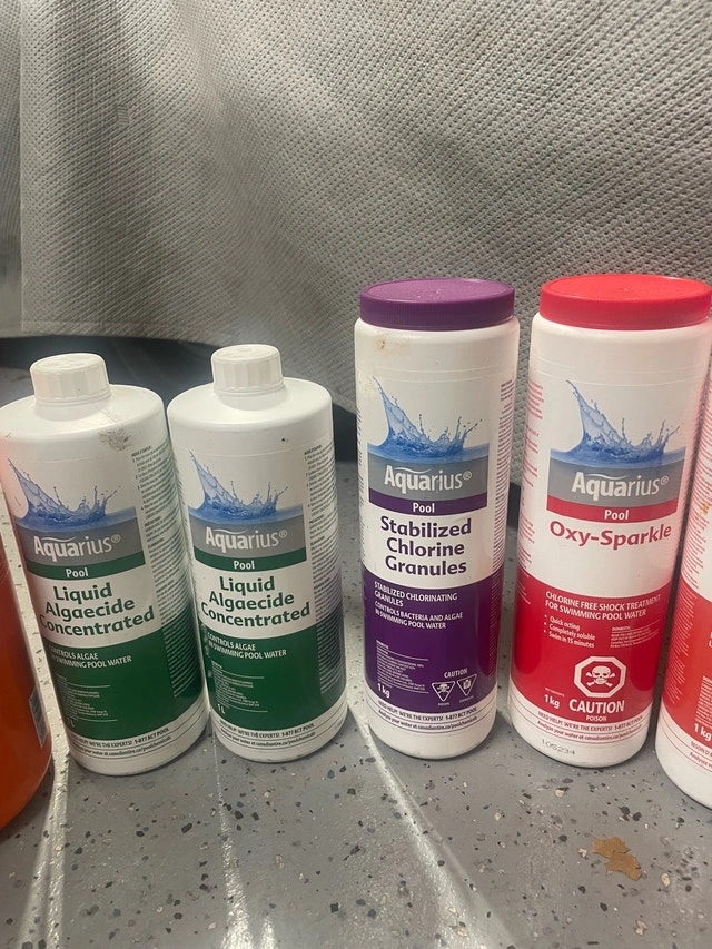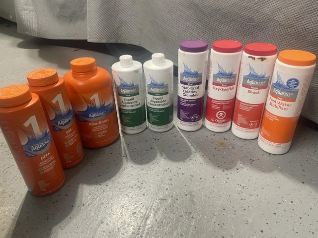 Aquarius pool chemicals to help maintain your pool's water quality. This lot includes pH adjusters, algaecide, chlorine granules, shock treatment, and stabilizer, all from the trusted Aquarius brand.