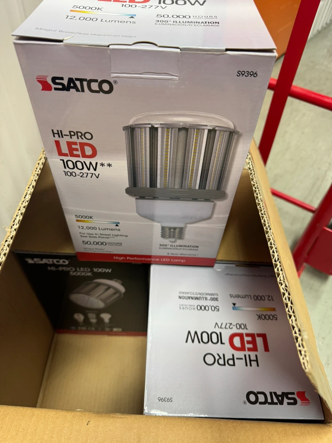 Selling a Satco S9396 100W LED light bulb. It's a high-performance LED lamp designed for use in street lighting. This bulb offers 12,000 lumens and has a 50,000-hour illumination rating. It operates on 100-277V. 4 boxes 400 each