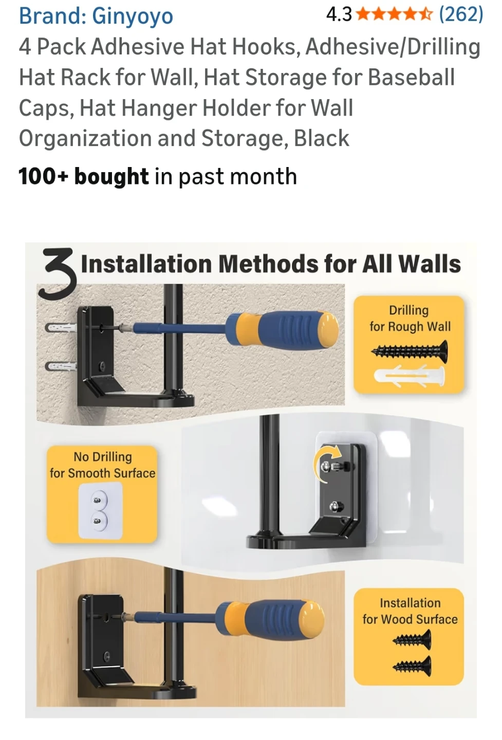 1 / 41 / 4Buy & SellNew 4-Pack Adhesive Hat Hooks - BlackNew 4-Pack Adhesive Hat Hooks - Black$5Selling a set of new adhesive hat hooks in black! Includes 4 hat racks. Perfect for organizing baseball caps and hats on the wall. Pickup in River GroveConditionNewWHERE TO MEETCheck LocationView MapSELLERverifiedHeidiRiver Grove1498 reviews0 chats·1 favorites·29 viewsSEND CHAT TO SELLERHi Heidi! I’m interested in your listing.Hi Heidi! I’m interested in your listing.Get the Karrot app to chatSign In to chat