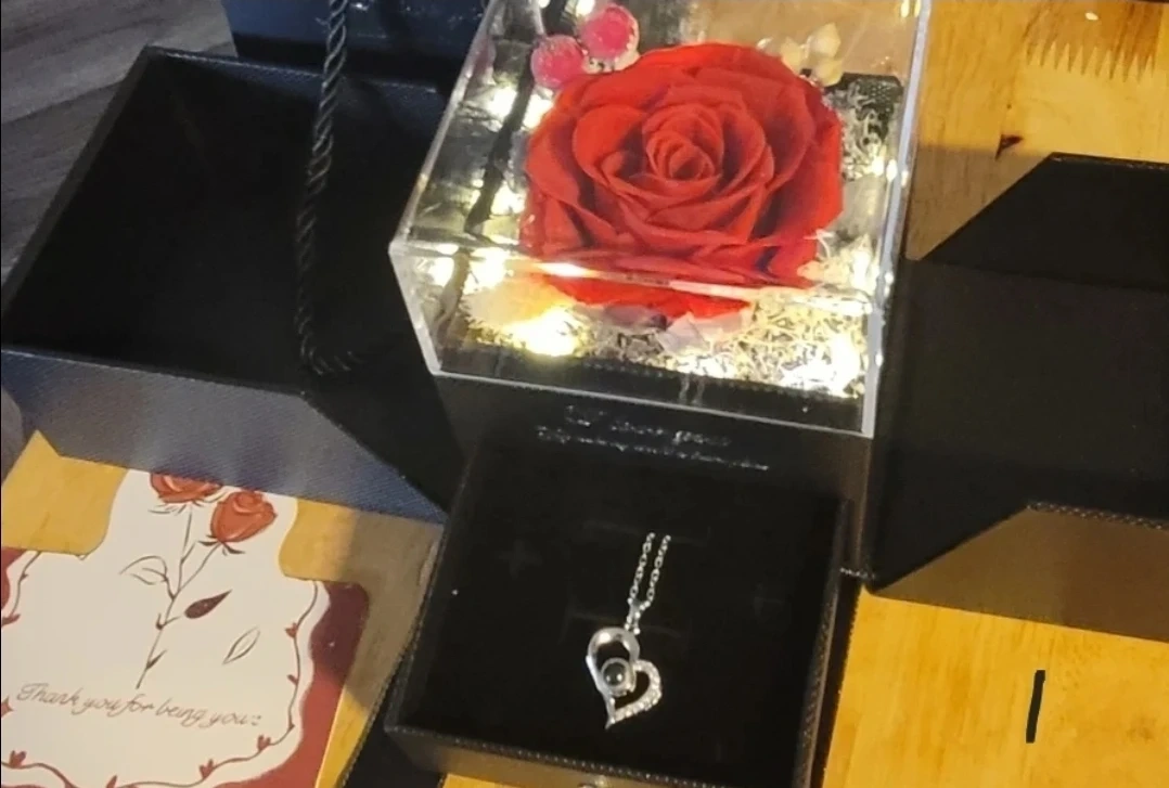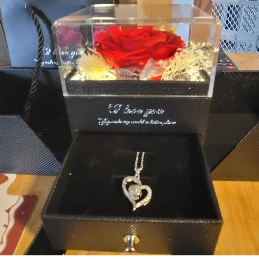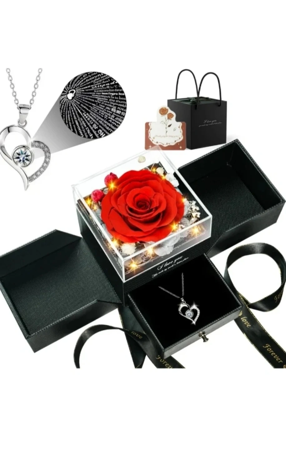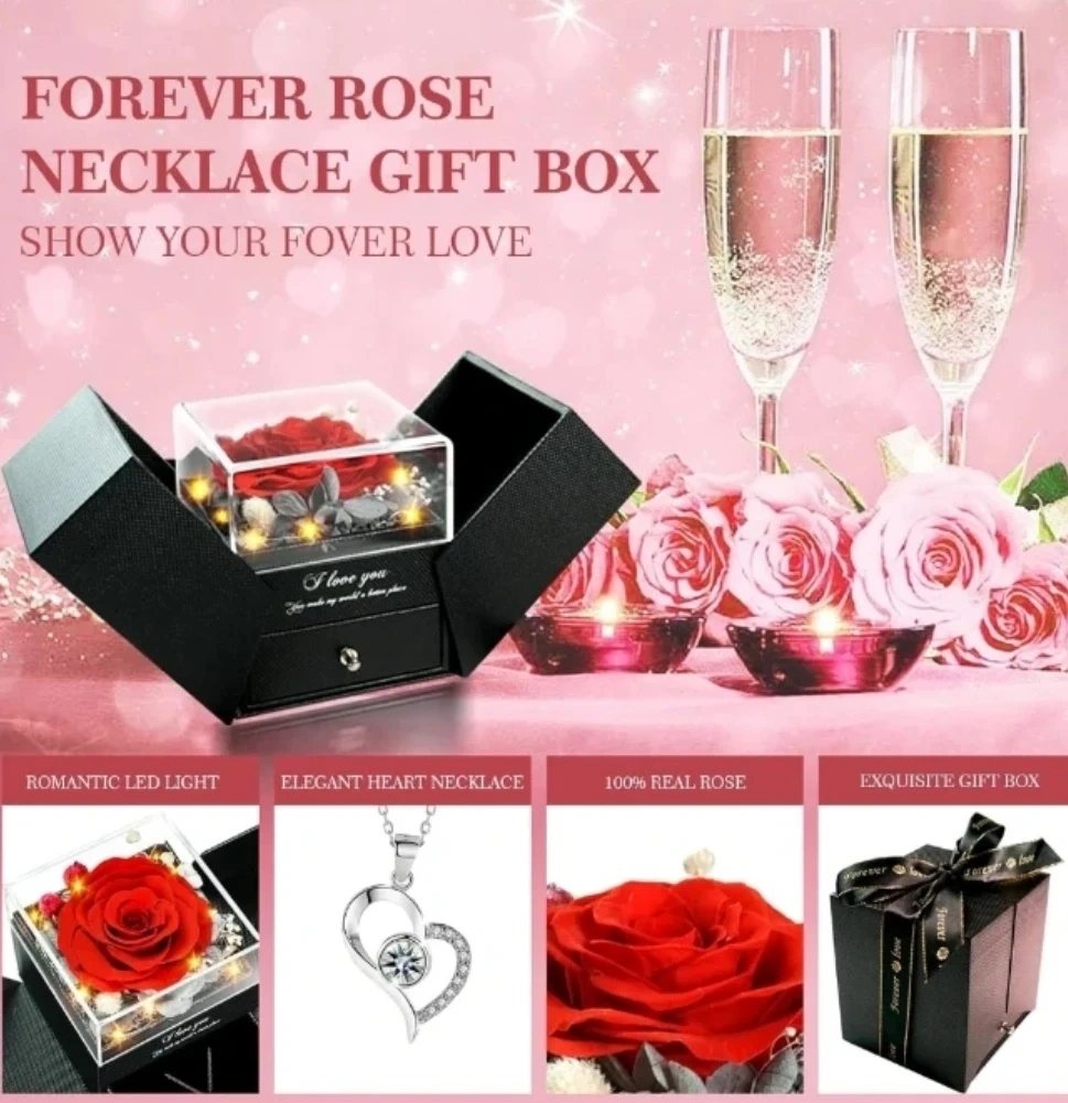 Selling a new Forever Rose Necklace with lighted Gift Box! It features a romantic LED light, an elegant heart necklace, and a 100% real rose. The set comes in an exquisite gift box. It's a lovely gift! Pickup in River Grove